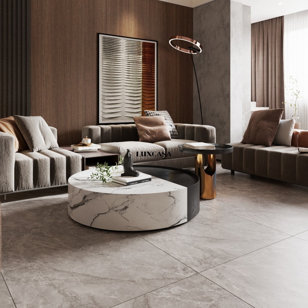 Trong hình bạn gửi, gạch được dùng để lát nền phòng khách với nội thất hiện đại: sofa xám, bàn đá tròn, đèn cây độc đáo và ánh sáng tự nhiên. Gạch này rất phù hợp với phong cách tối giản, sang trọng hoặc Scandinavian.