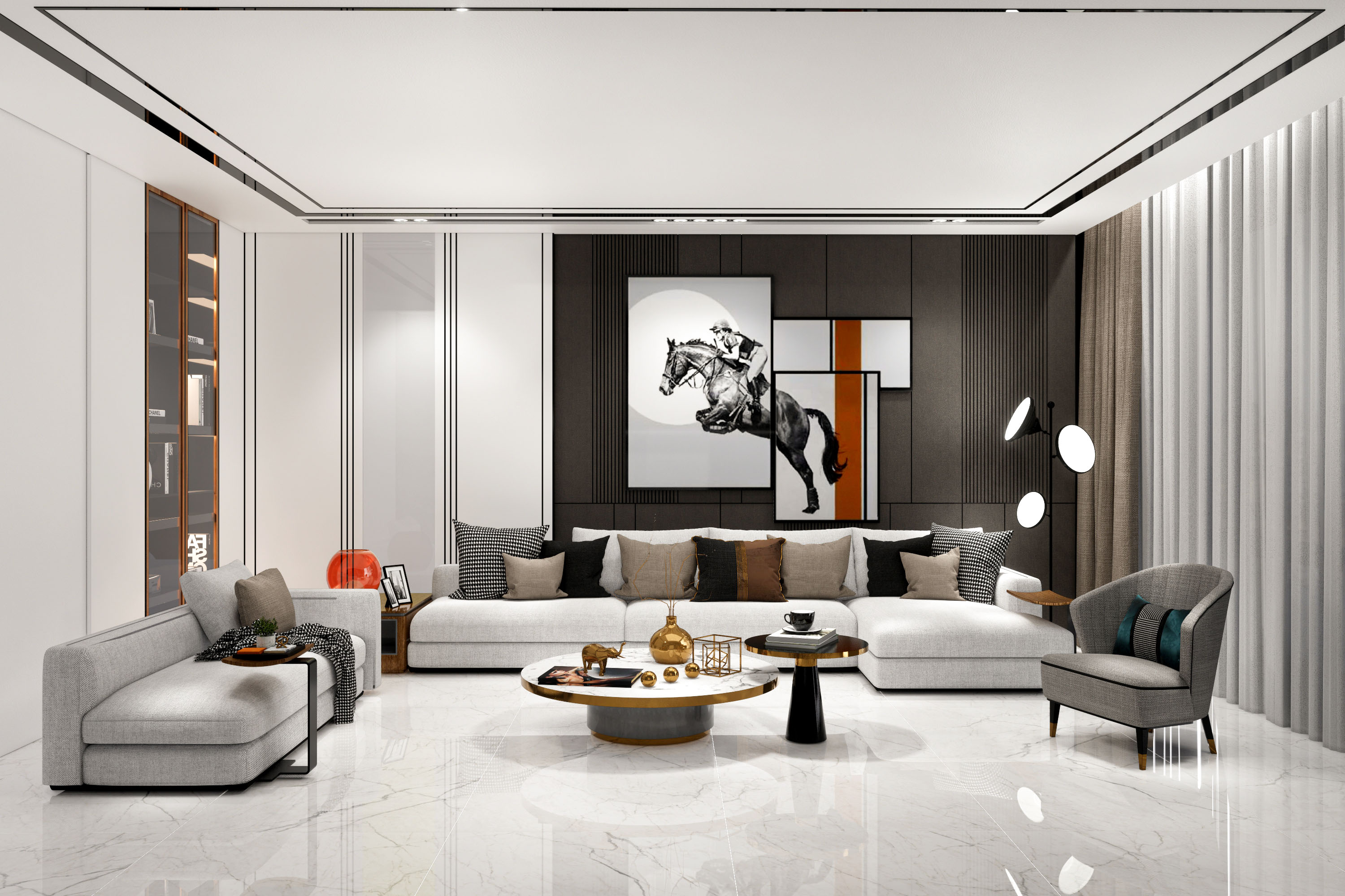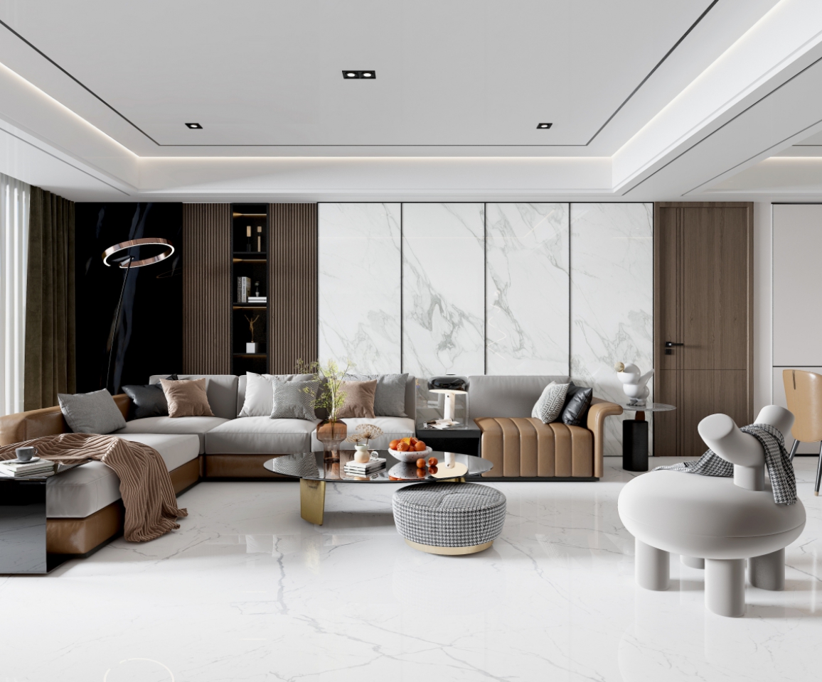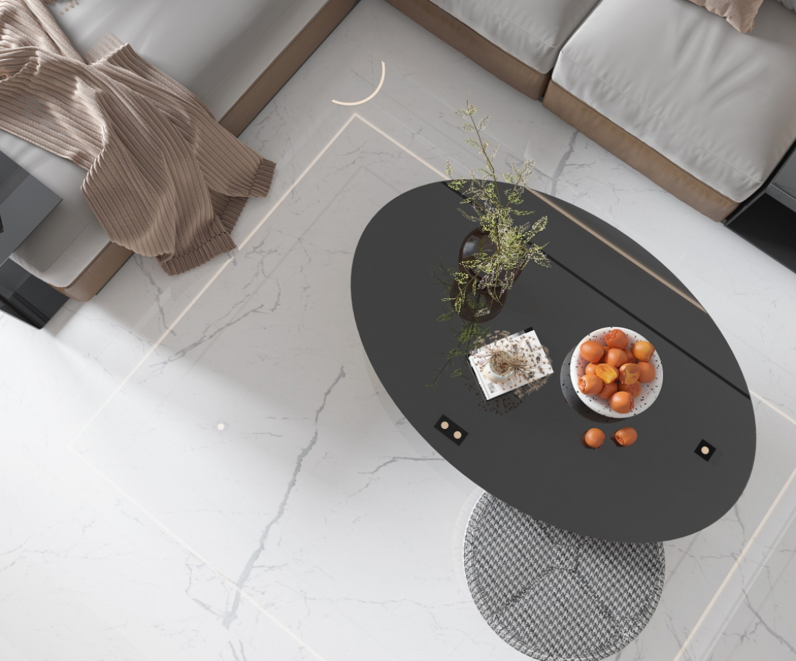Hãy thêm nét thanh lịch và sang trọng vào trong phòng khách của bạn bằng việc dùng gạch giả đá lát nền màu trắng mô phỏng lại nét sang trọng của dòng đá marble. Lát những viên gạch trắng, bóng kiếng kiểu thảm để những đường chạy xung quanh màu đen trên một nền trắng bóng sẽ giúp tạo điểm nhấn dưới nền nhà, đặc biệt kiểu lát thảm này rất phù hợp khi kết hợp với gạch ốp tường phòng khách.
