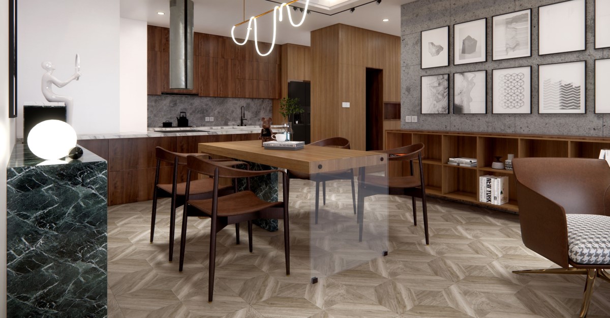 Mẫu gạch lát 60x60 vân gỗ cho nhà bếp và phòng ăn đang thu hút sự quan tâm với vẻ đẹp tự nhiên và sự sang trọng mà chúng mang lại. Với vẻ đẹp vân gỗ tự nhiên, chúng tạo ra không gian ấm cúng và gần gũi, đồng thời tạo cảm giác rộng lớn và hiện đại cho không gian bếp và phòng ăn.