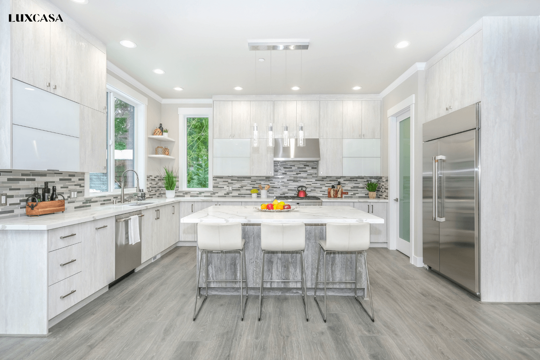 Thiết kế khu bếp với sàn màu xám giả gỗ