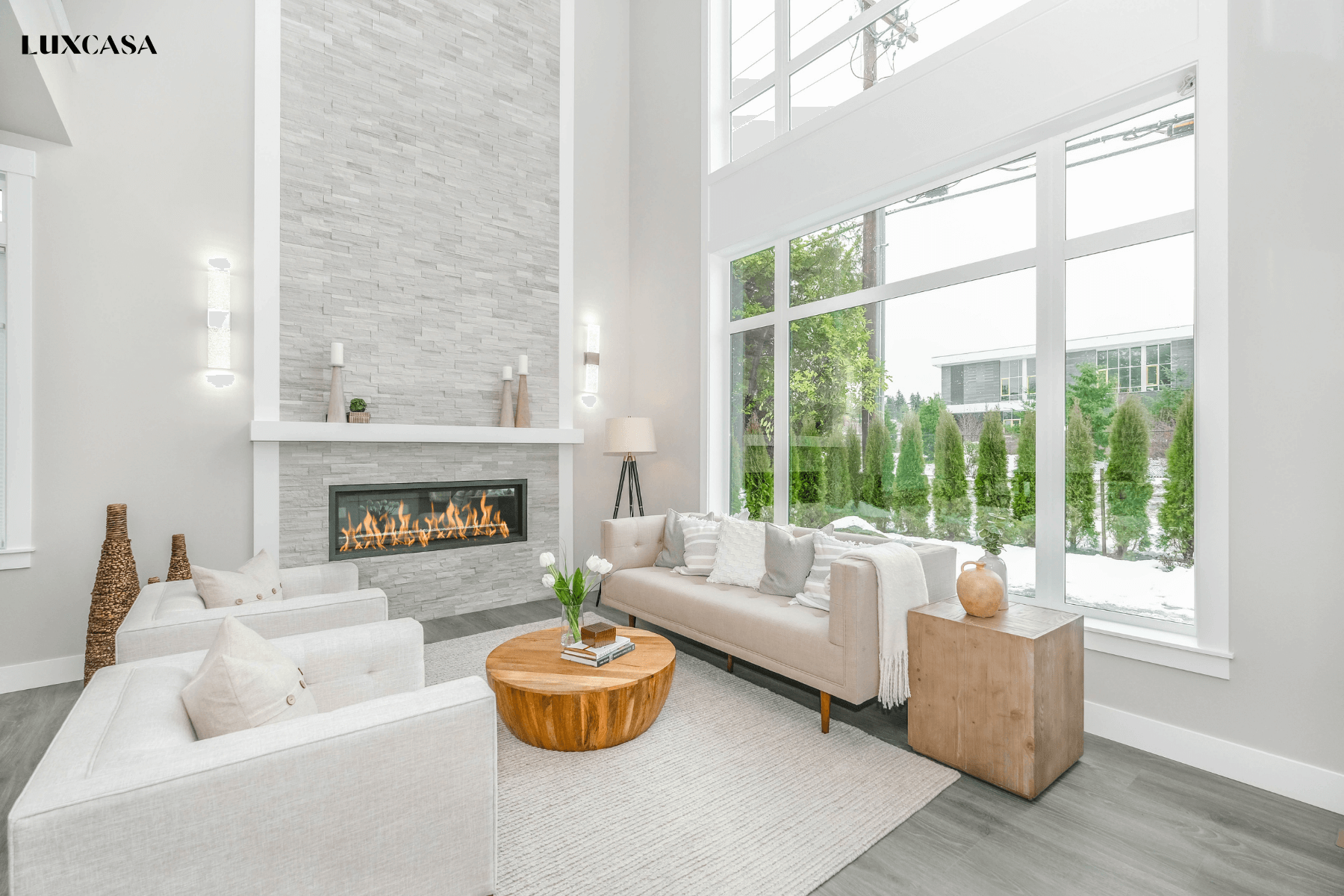 Phòng khách được lát bằng gạch giả gỗ xám trắng