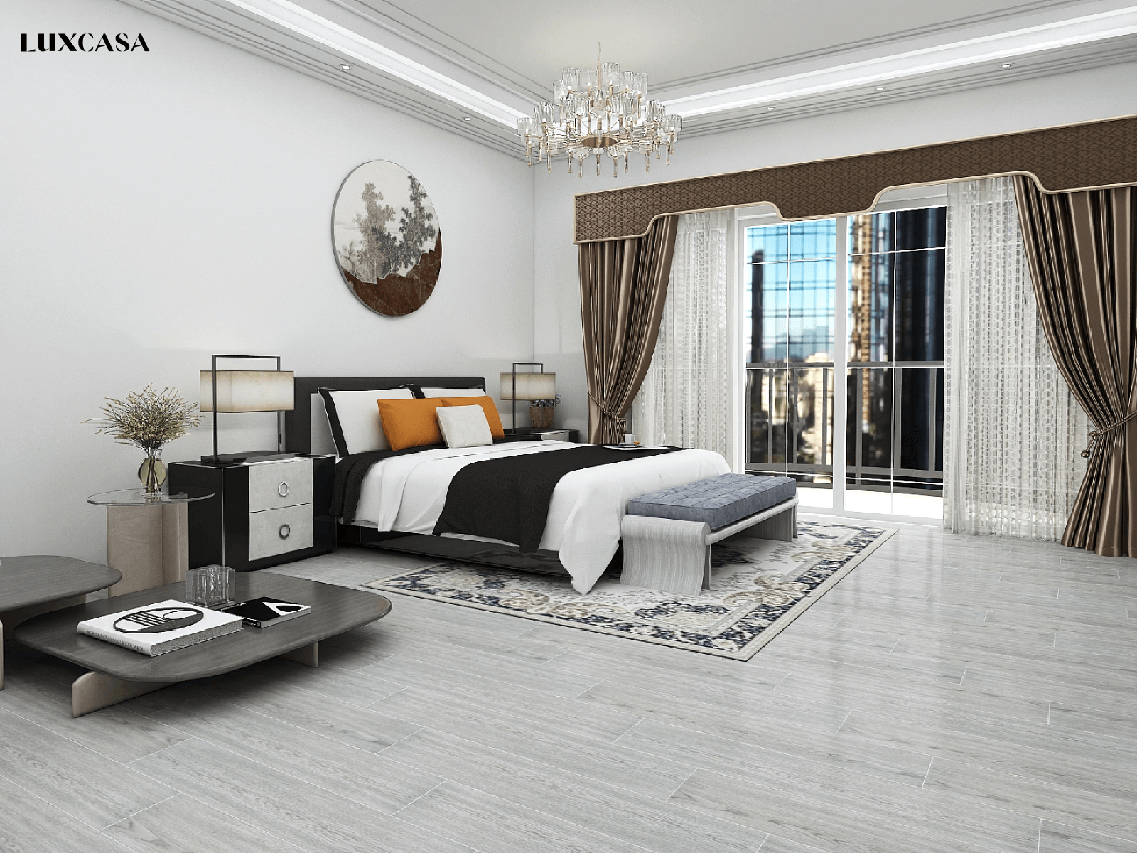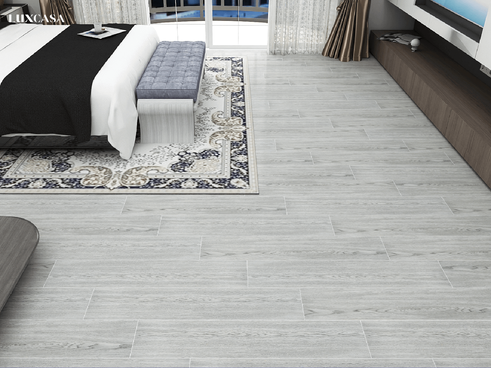 Gạch giả gỗ xám trắng cho phòng ngủ