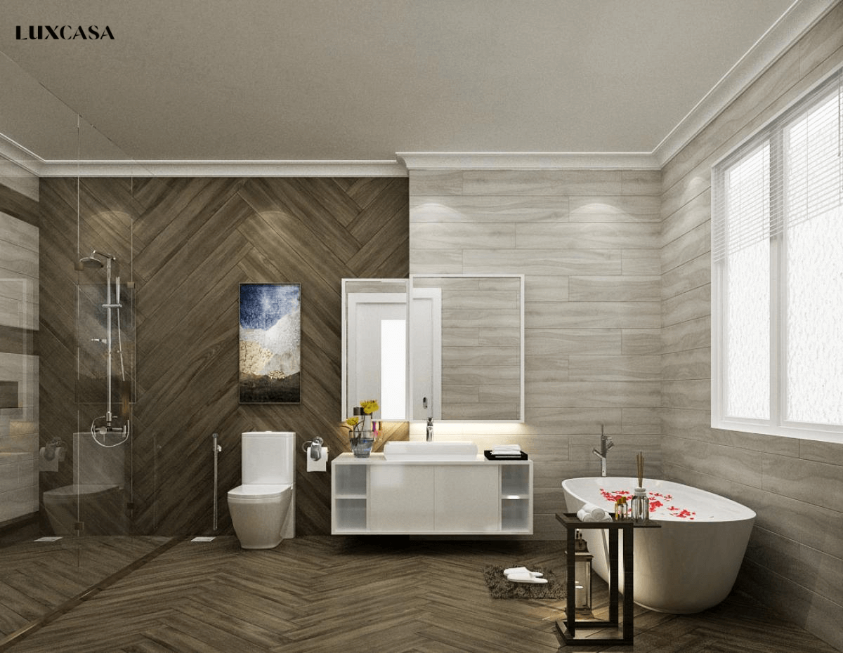 Phòng tắm được ốp bằng gạch giả gỗ màu xám