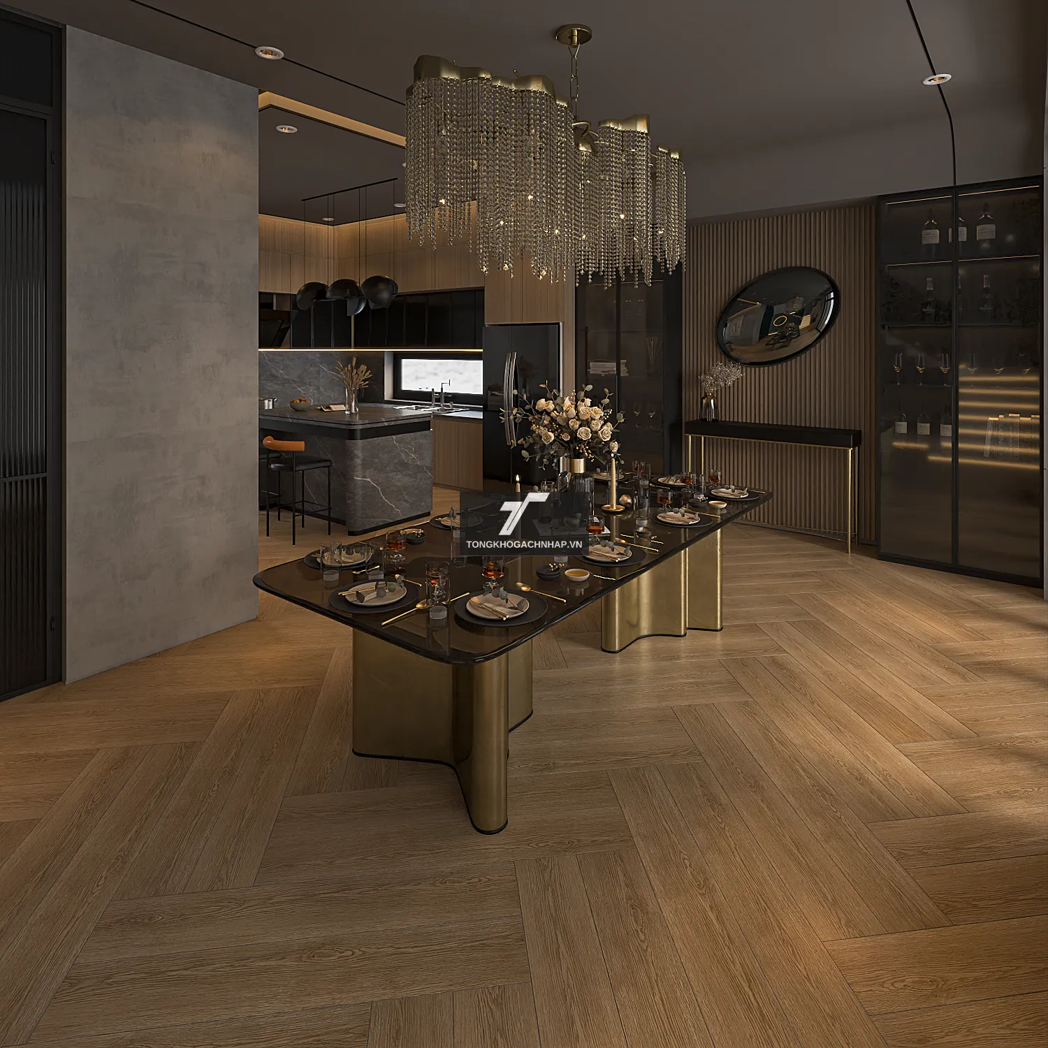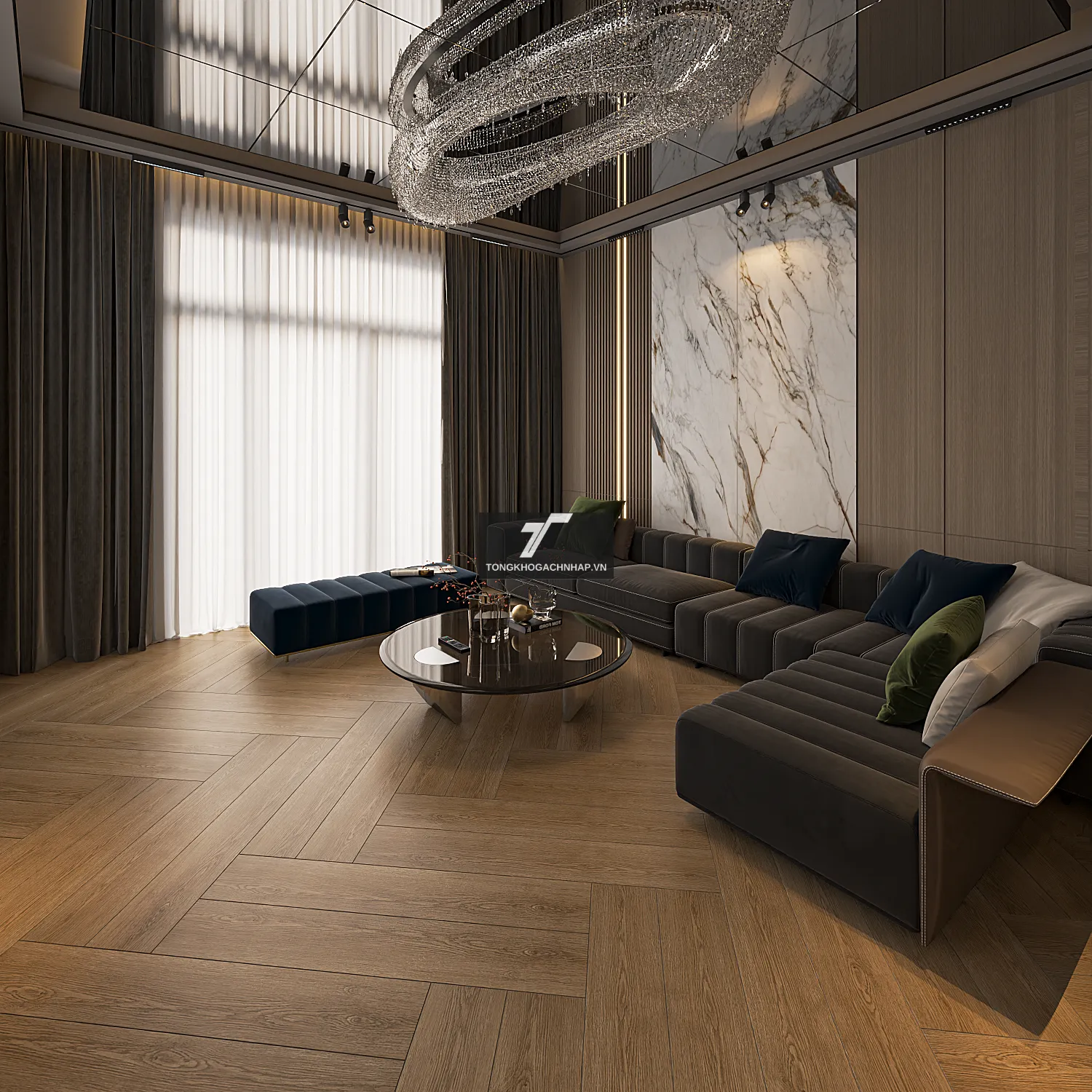 Phòng khách luôn là "linh hồn" của ngôi nhà, nơi thể hiện rõ nét nhất gu thẩm mỹ của gia chủ. Việc lựa chọn gạch lát nền phòng khách giả gỗ mã 212LU212761 giúp kiến tạo nên một không gian tiếp khách vừa sang trọng, vừa gần gũi với thiên nhiên. Tông màu gỗ hài hòa của gạch rất dễ phối hợp cùng các món đồ nội thất như sofa da, bàn trà gỗ hay các vách nan trang trí, tạo nên một tổng thể thống nhất và tinh tế.