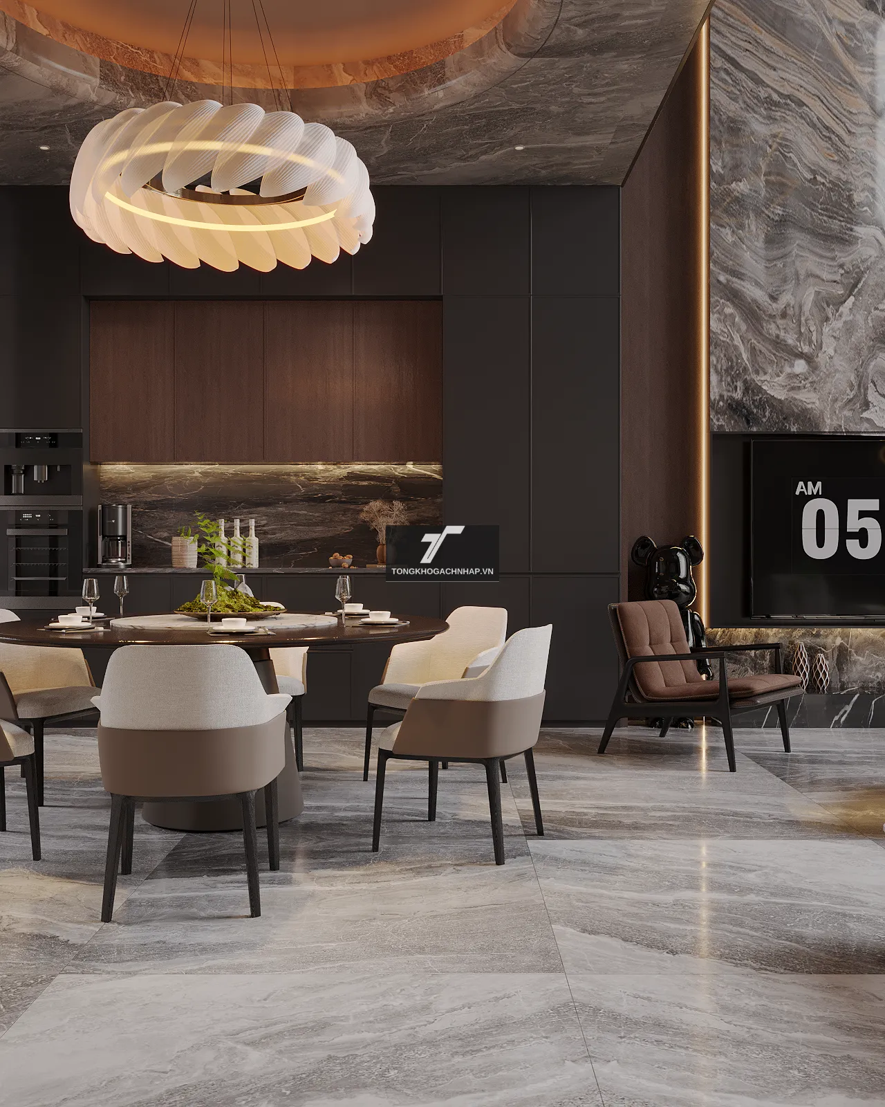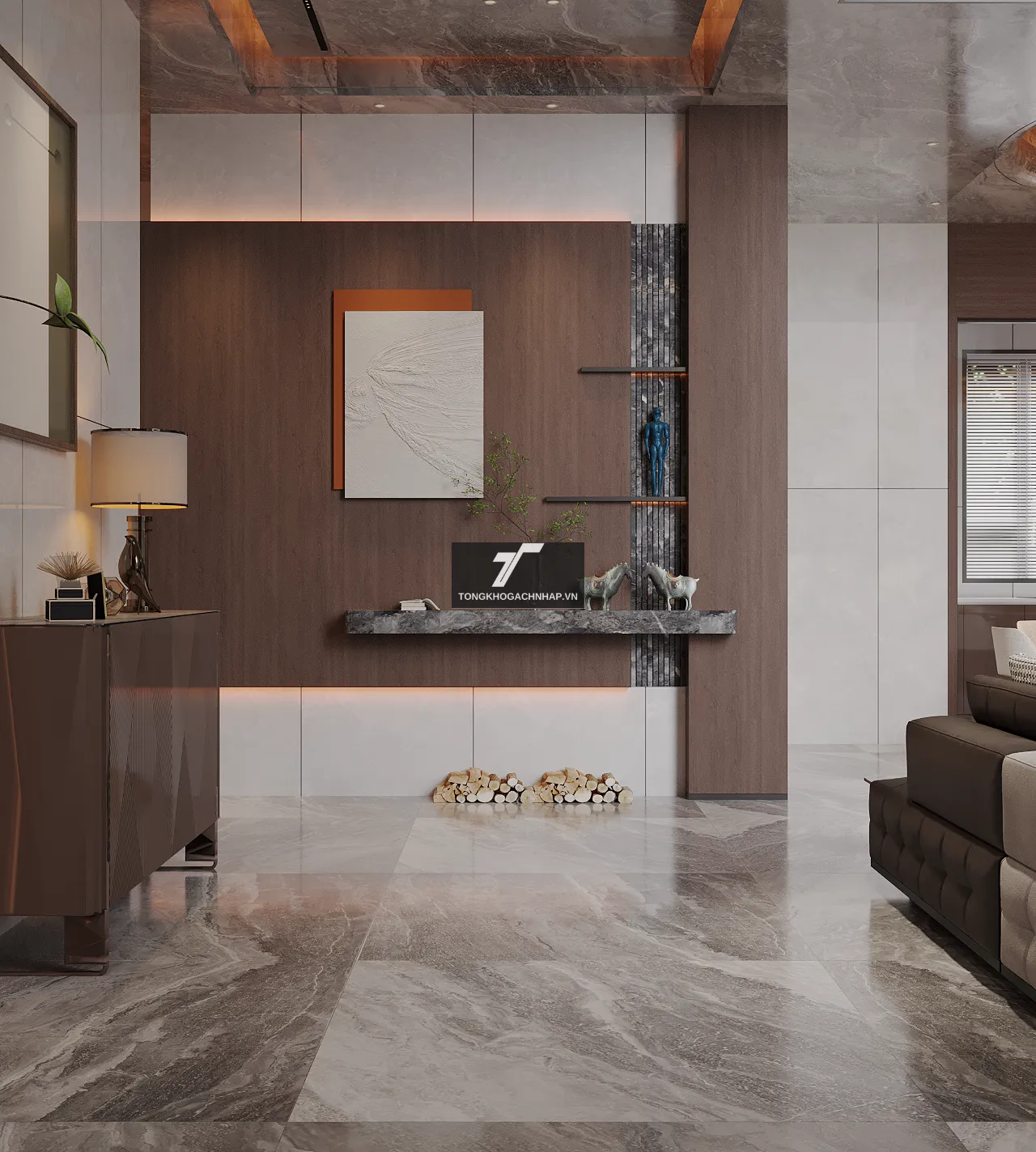 Sản phẩm đặc biệt phù hợp với phong cách kiến trúc Industrial (Công nghiệp) hoặc Modern Classic (Hiện đại cổ điển). Bạn có thể kết hợp sàn gạch này với những bộ sofa da cao cấp, bàn trà kim loại mạ vàng hoặc các mảng tường gỗ trầm ấm để tạo nên sự tương phản đầy tính nghệ thuật. Dưới ánh sáng đèn trần chiếu xuống, bề mặt bóng mờ của gạch sẽ tạo nên một độ sâu huyền bí, giúp phòng khách luôn giữ được vẻ đẹp tinh tế và không bao giờ lỗi mốt.