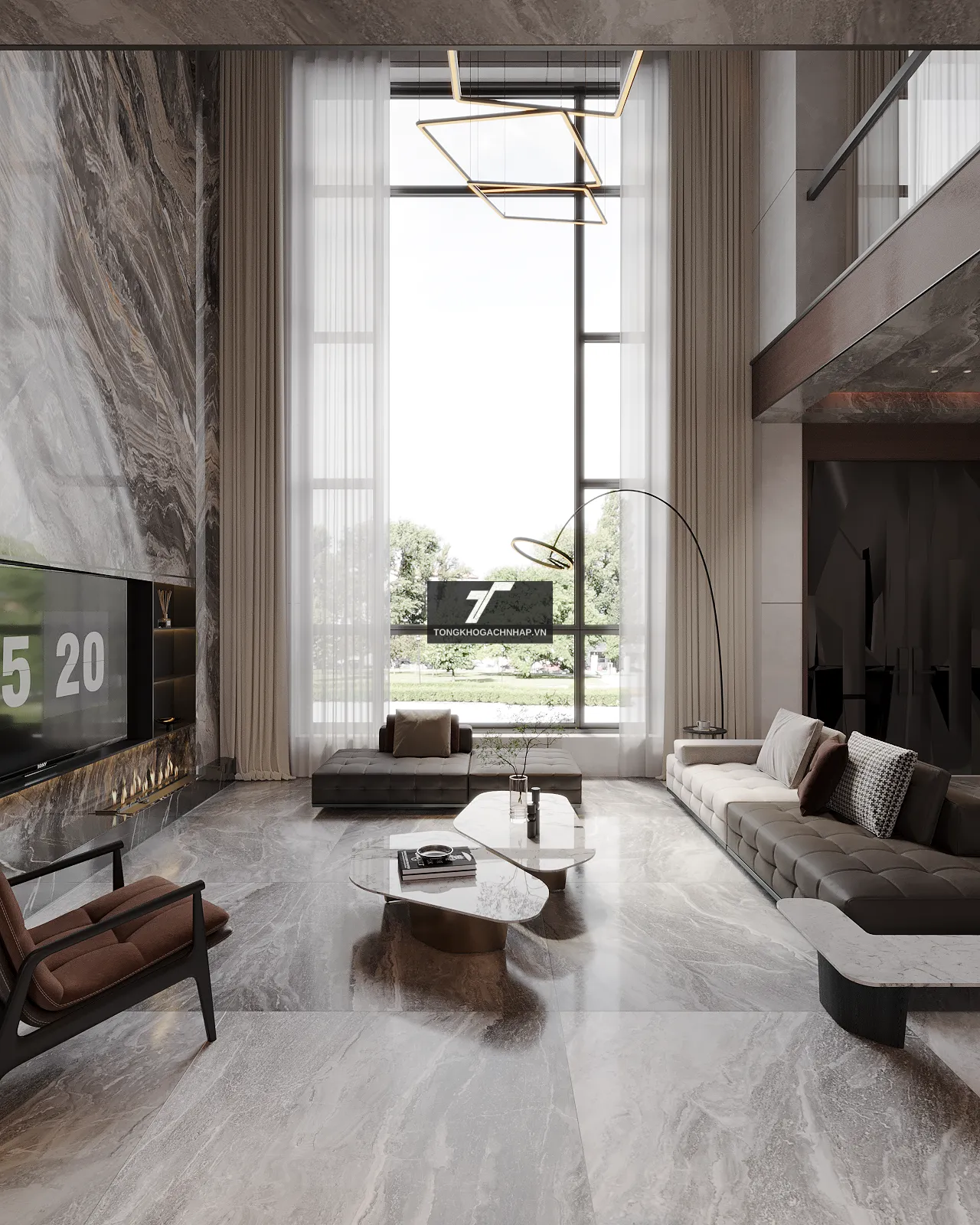 Việc thi công gạch khổ lớn đòi hỏi tay nghề kỹ thuật cao nhưng kết quả mang lại vô cùng xứng đáng. Sàn nhà sẽ trông bề thế, uy nghi hơn hẳn so với việc sử dụng các khổ gạch nhỏ 60x60 hay 80x80cm. Bên cạnh đó, ít đường ron cũng đồng nghĩa với việc ít nơi tích tụ bụi bẩn, giúp quá trình vệ sinh lau chùi trở nên nhanh chóng và dễ dàng hơn bao giờ hết. Đây chính là giải pháp kiến trúc lý tưởng cho các căn biệt thự, penthouse hay sảnh khách sạn hạng sang.