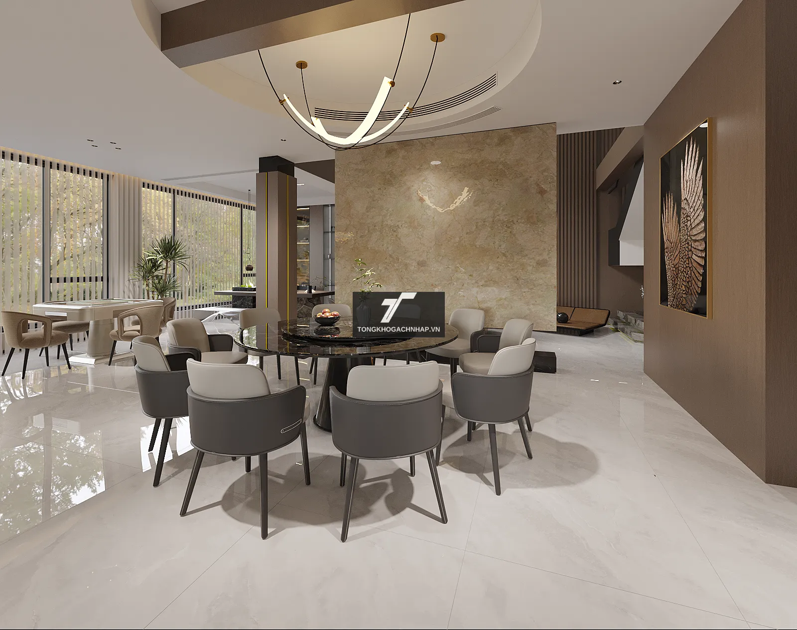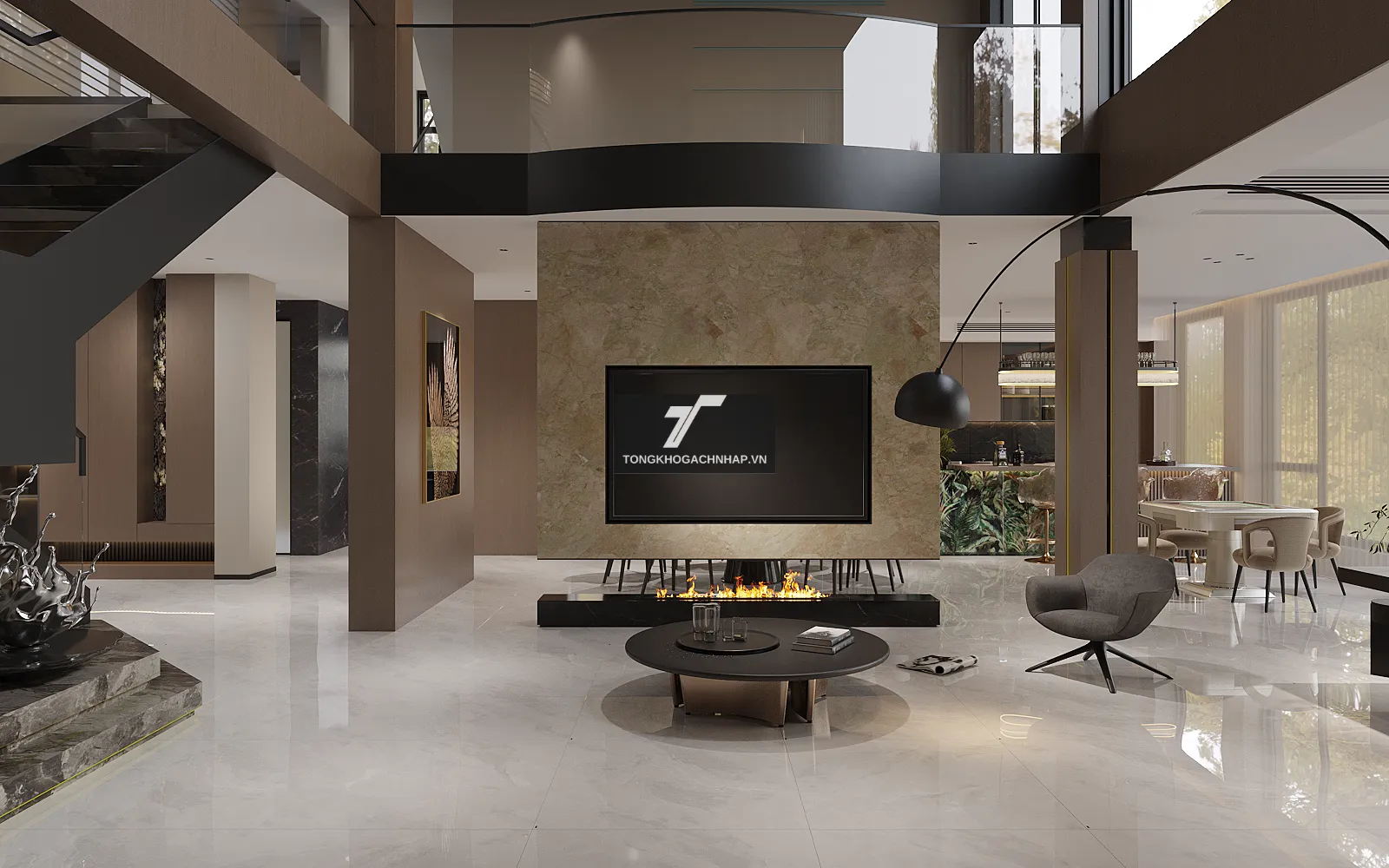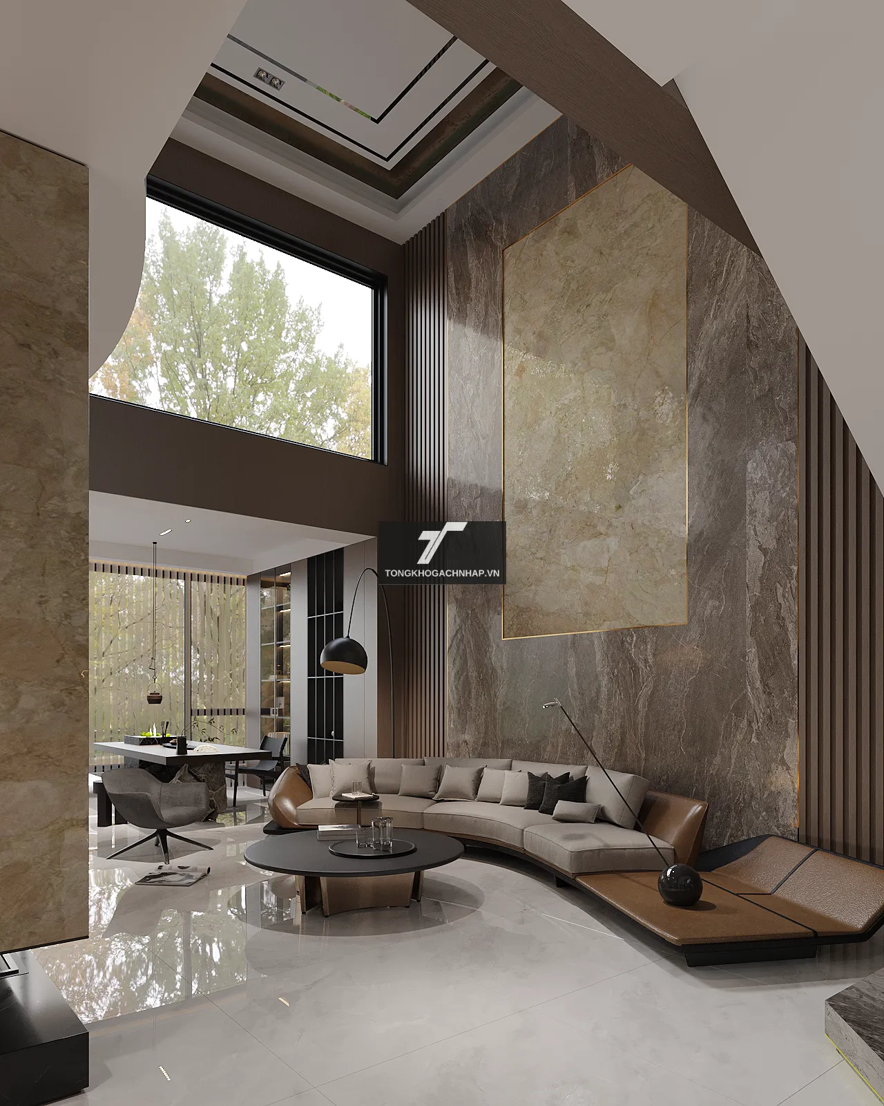 Phòng khách luôn được coi là khu vực quan trọng nhất, là nơi thể hiện rõ nét cá tính của người chủ gia đình. Chính vì vậy, việc sử dụng các mẫu gạch lát nền phòng khách có tông màu trắng sáng và kích thước lớn sẽ ngay lập tức nâng tầm đẳng cấp cho toàn bộ ngôi nhà. Sắc trắng mang lại sự thoáng đãng, trong khi họa tiết giả đá tinh xảo tạo nên chiều sâu nghệ thuật, biến căn phòng trở thành một không gian đón khách vô cùng ấn tượng.