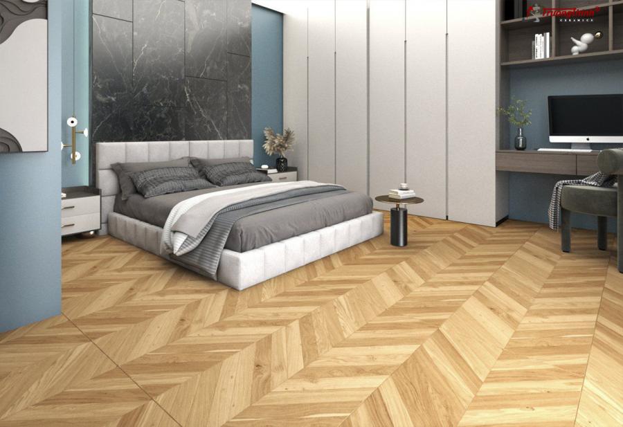 Mẫu gạch phòng ngủ vân gỗ màu sáng cho thiết kế theo phong cách hiện đại