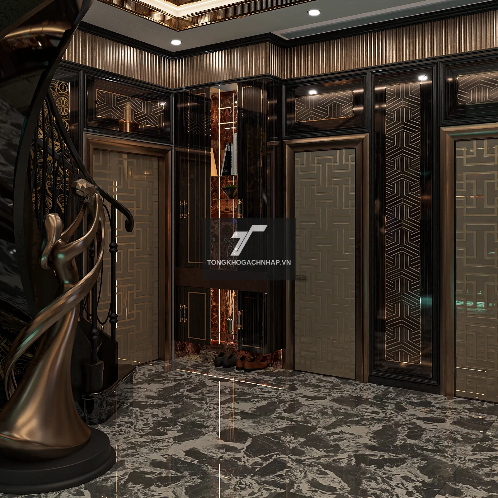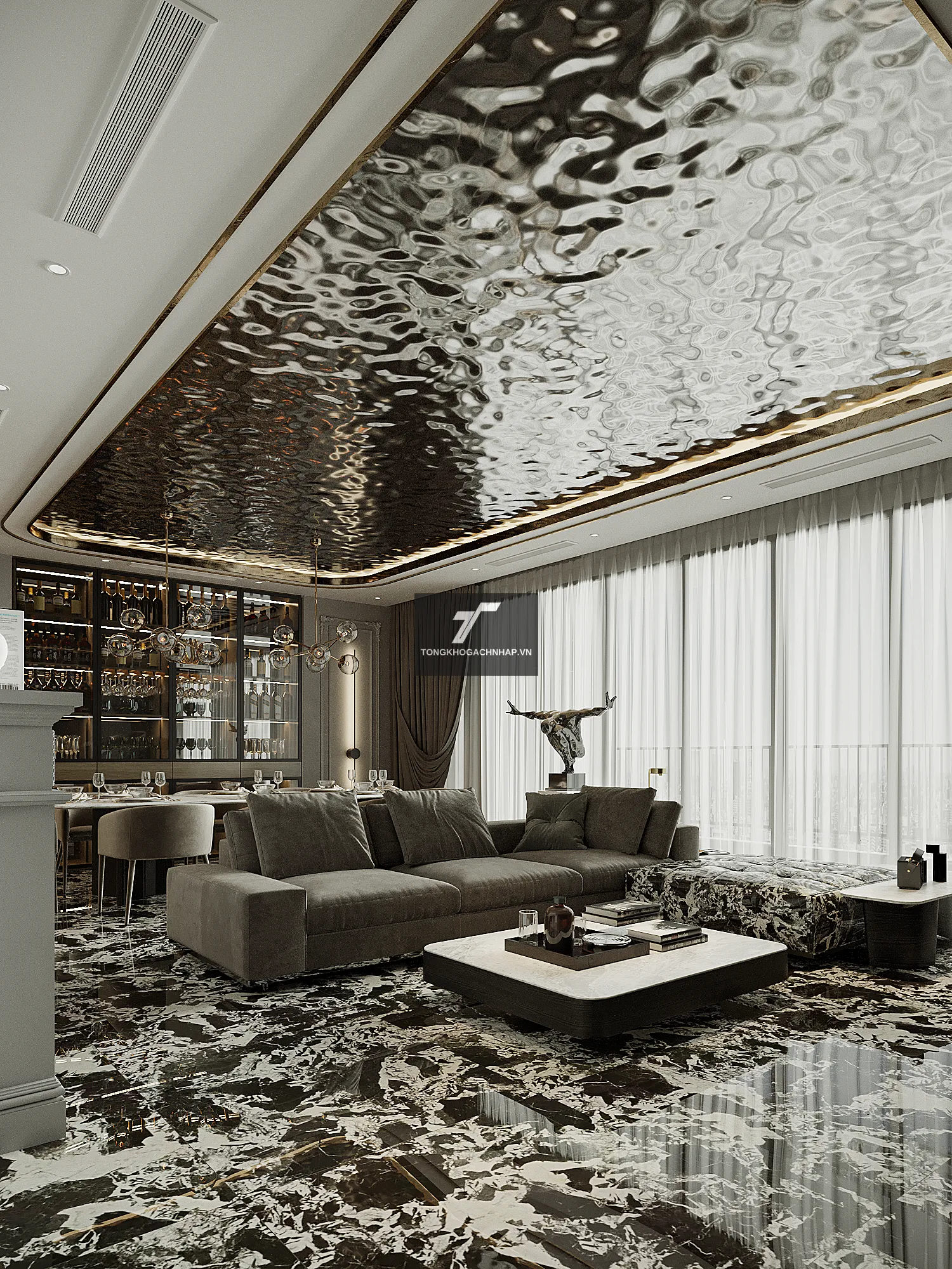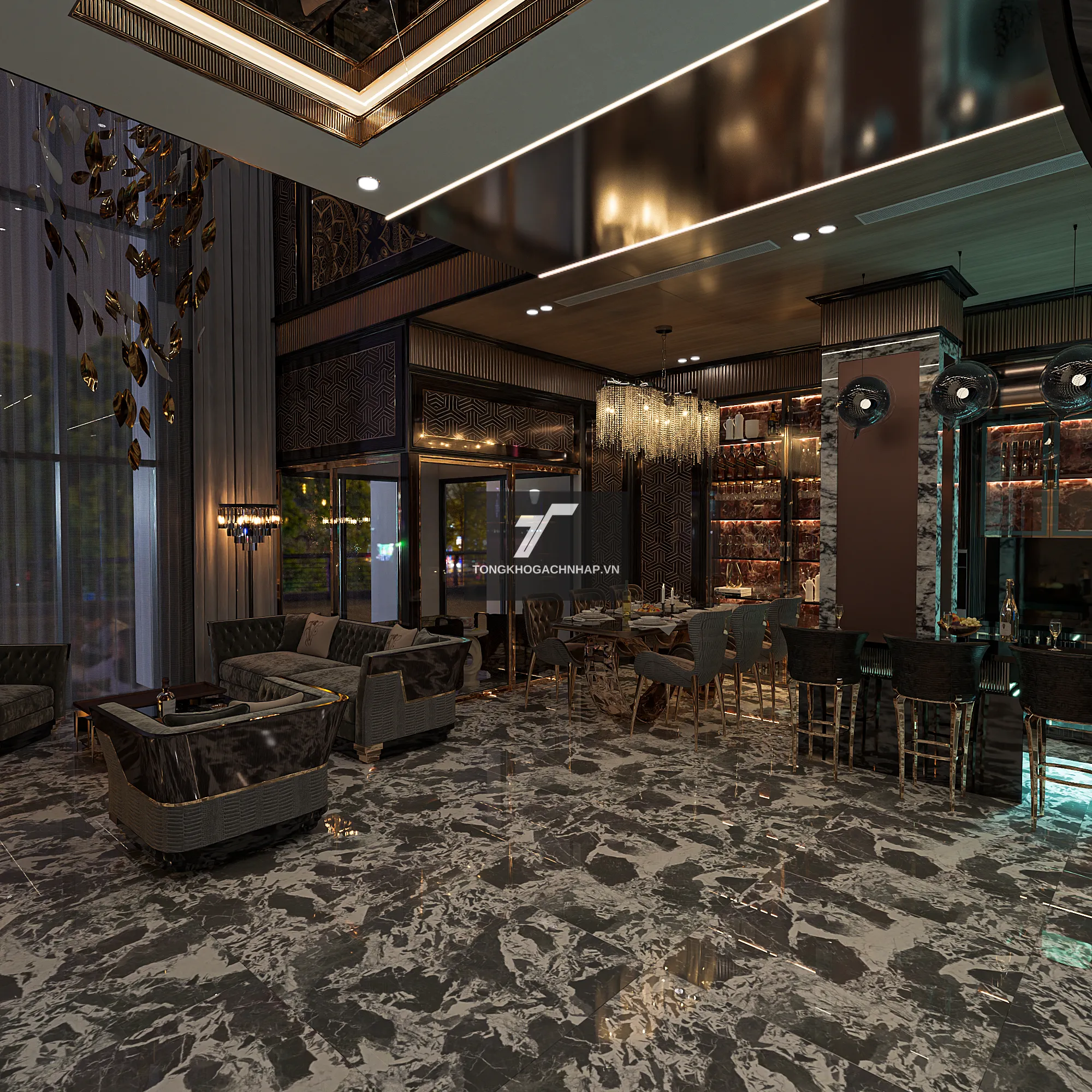 Công nghệ in kỹ thuật số tiên tiến giúp từng đường vân trở nên sắc nét, có chiều sâu như đá tự nhiên được khai thác từ những mỏ đá quý. Khi ánh sáng đèn trần chiếu vào, bề mặt bóng của gạch sẽ tạo ra những hiệu ứng thị giác lấp lánh, biến sàn nhà thành một tác phẩm nghệ thuật đầy mê hoặc.