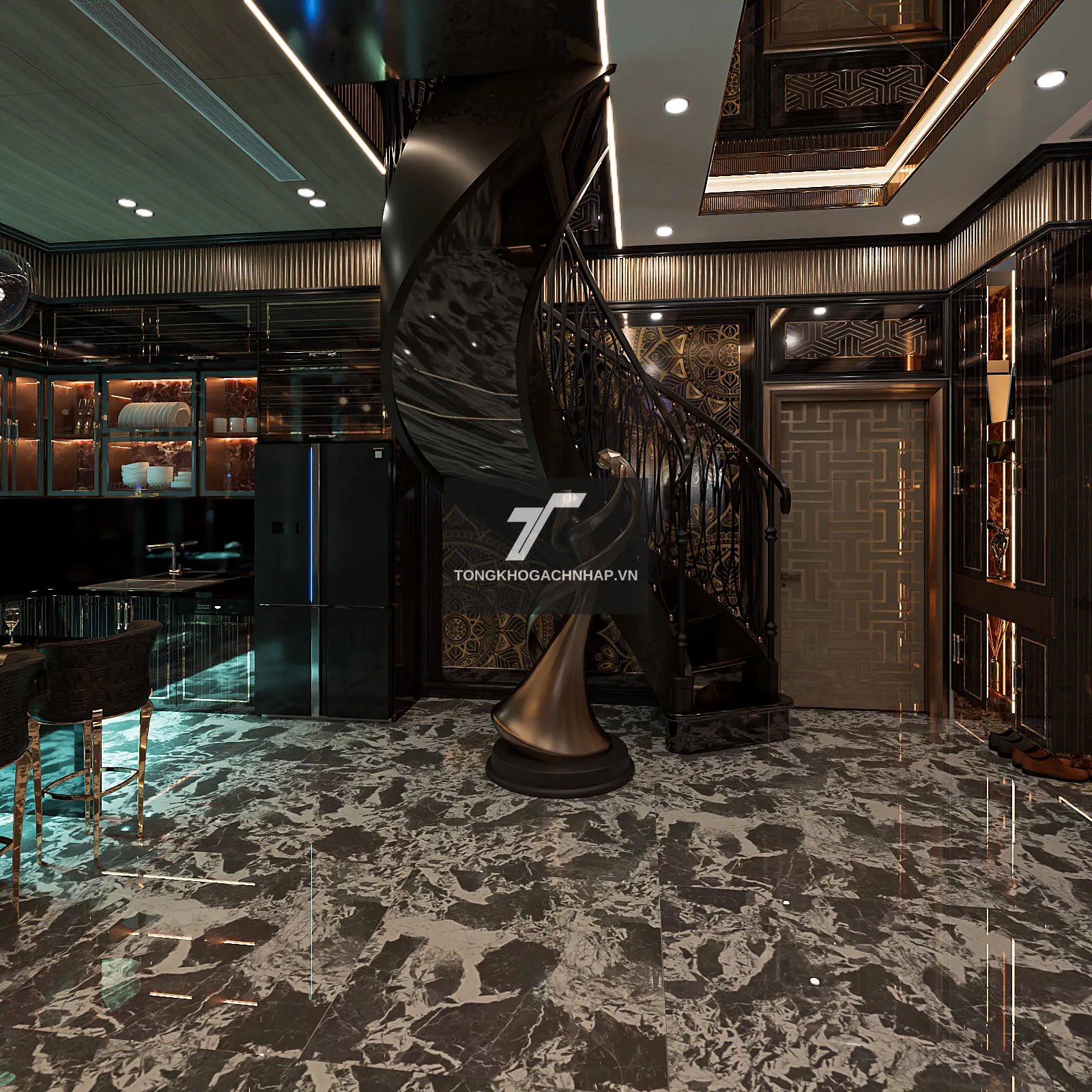 Màu đen huyền bí kết hợp với bề mặt bóng kính không chỉ giúp phản chiếu ánh sáng tốt hơn mà còn tạo nên một "chiếc gương" khổng lồ dưới chân, làm tôn lên vẻ đẹp của đồ nội thất. Đây là lựa chọn lý tưởng cho những gia chủ yêu thích phong cách tối giản nhưng vẫn muốn khẳng định cá tính mạnh mẽ.