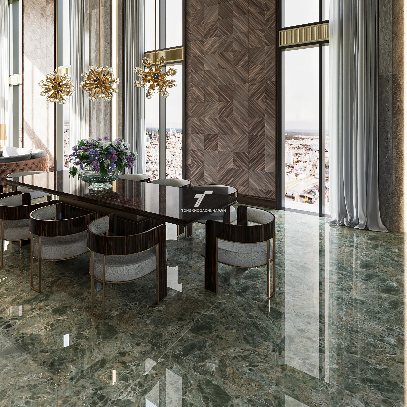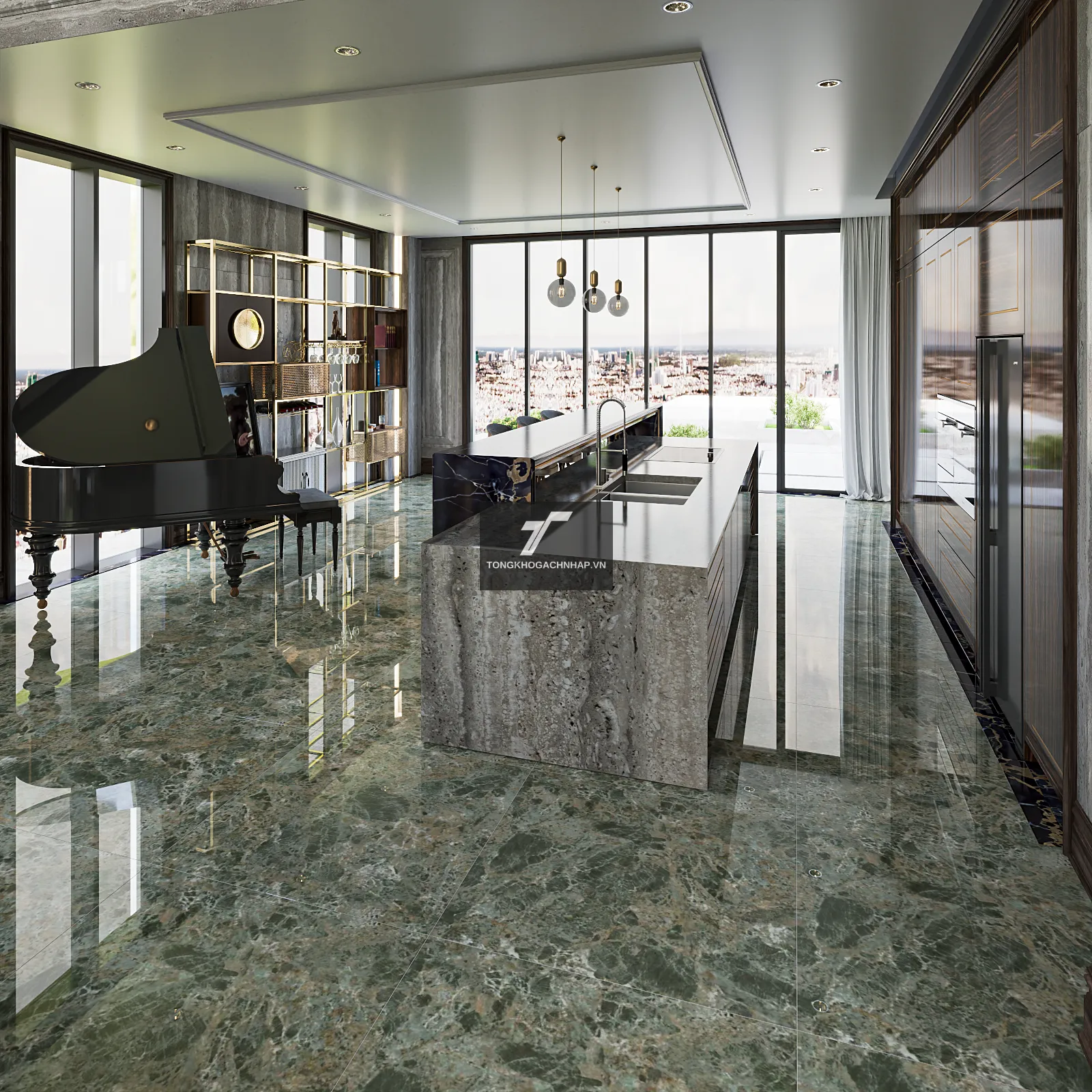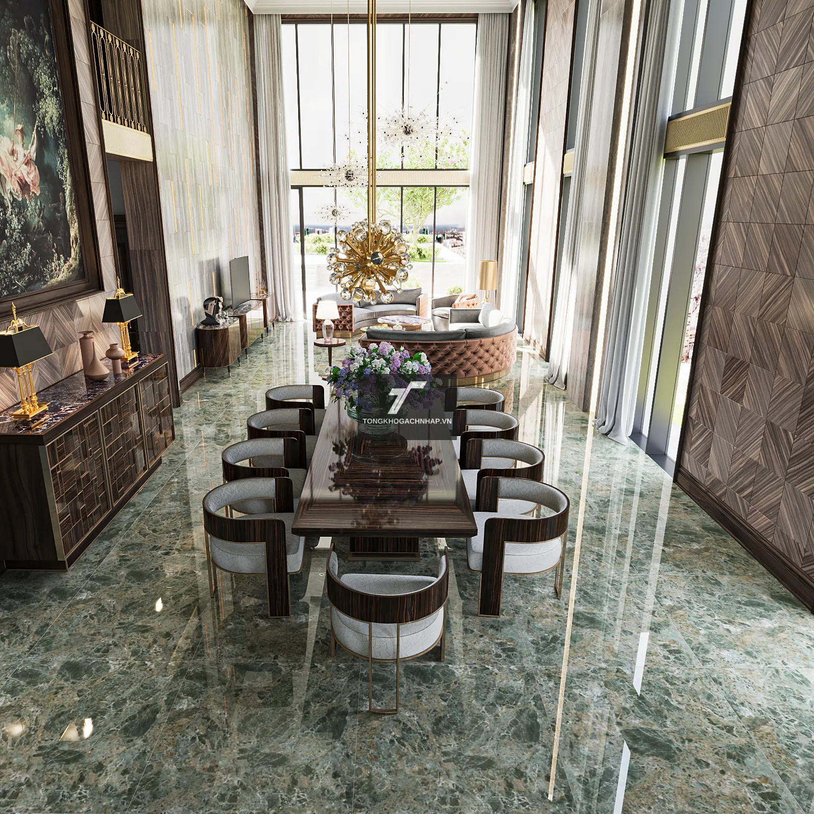 Phối hợp nội thất: Bạn có thể kết hợp sàn gạch xanh với ghế sofa màu kem, xám nhạt hoặc các chi tiết kim loại mạ vàng (gold) để tạo nên vẻ đẹp vương giả.