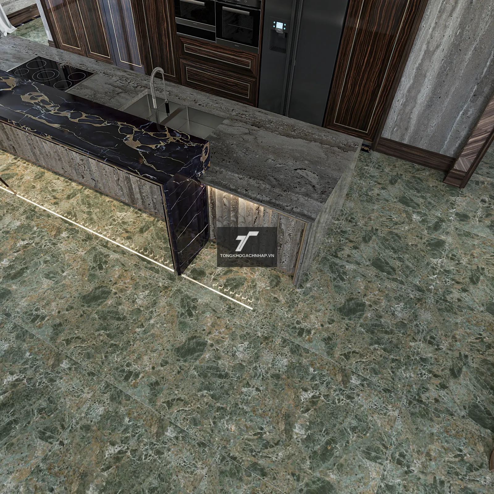 Với thiết kế "4 mặt vân" (faces), mỗi viên gạch là một biến thể riêng biệt, khi lát cạnh nhau chúng tạo nên một bức tranh thiên nhiên sống động, mô phỏng vẻ đẹp kỳ vĩ của đá cẩm thạch trong tự nhiên. Bề mặt bóng kính của gạch không chỉ giúp không gian thêm sáng sủa nhờ khả năng phản xạ ánh sáng tốt mà còn làm sâu thêm các lớp vân đá, tạo hiệu ứng 3D đầy lôi cuốn. Màu xanh này còn mang ý nghĩa phong thủy tốt lành, tượng trưng cho sự thịnh vượng và bình an cho gia chủ.