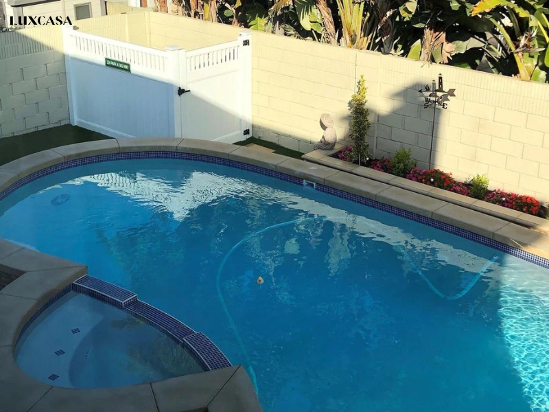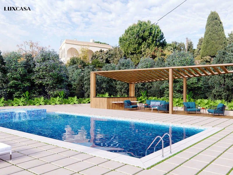 Gạch màu đỏ được sử dụng để ốp lát hồ bơi villa, tạo nên không gian sang trọng và đẳng cấp.