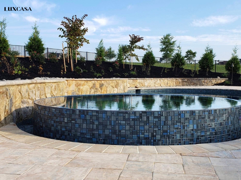 Gạch mosaic đa kích thước và màu sắc khác nhau là lựa chọn tuyệt vời để ốp hồ bơi hình tròn, tạo điểm nhấn cho không gian.