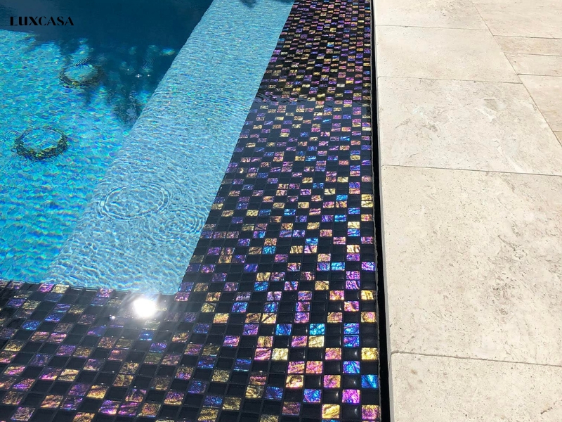 Các loại gạch mosaic với tông màu tối như đen, xám, và tím lát ốp bể bơi luôn tạo nên một vẻ đẹp đặc biệt và sang trọng.