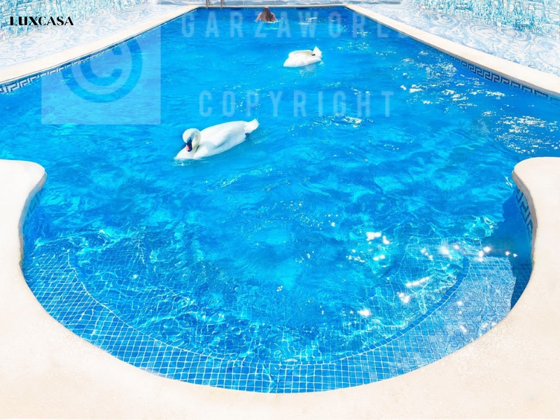 Sự kết hợp giữa màu sắc xanh nước biển trên nền gạch mosaic bao quanh bể bơi làm cho bạn cảm thấy như đang hòa mình vào thiên nhiên.