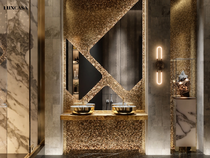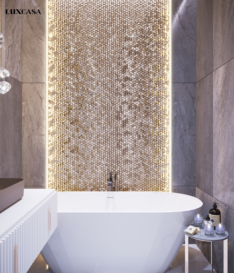 Gạch mosaic kim loại với ánh sáng vàng là lựa chọn cao cấp để trang trí không gian nhà tắm.
