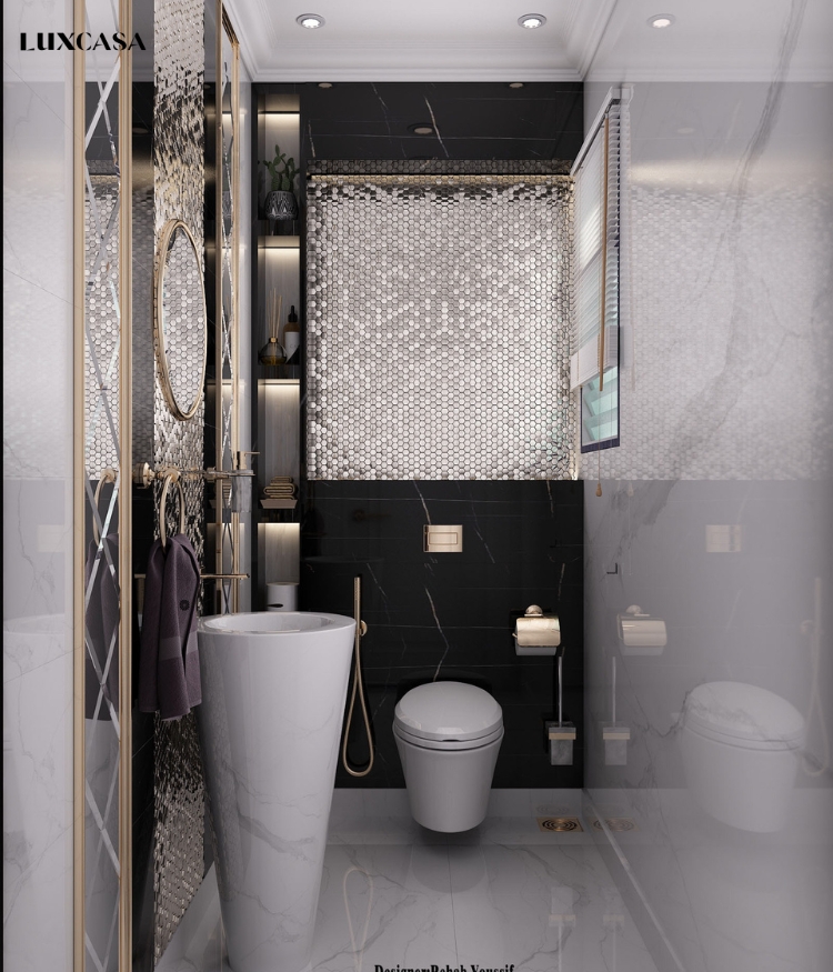 Gạch mosaic lục giác với họa tiết kim loại bạc tạo nên phong cách tân cổ điển độc đáo cho không gian phòng tắm.