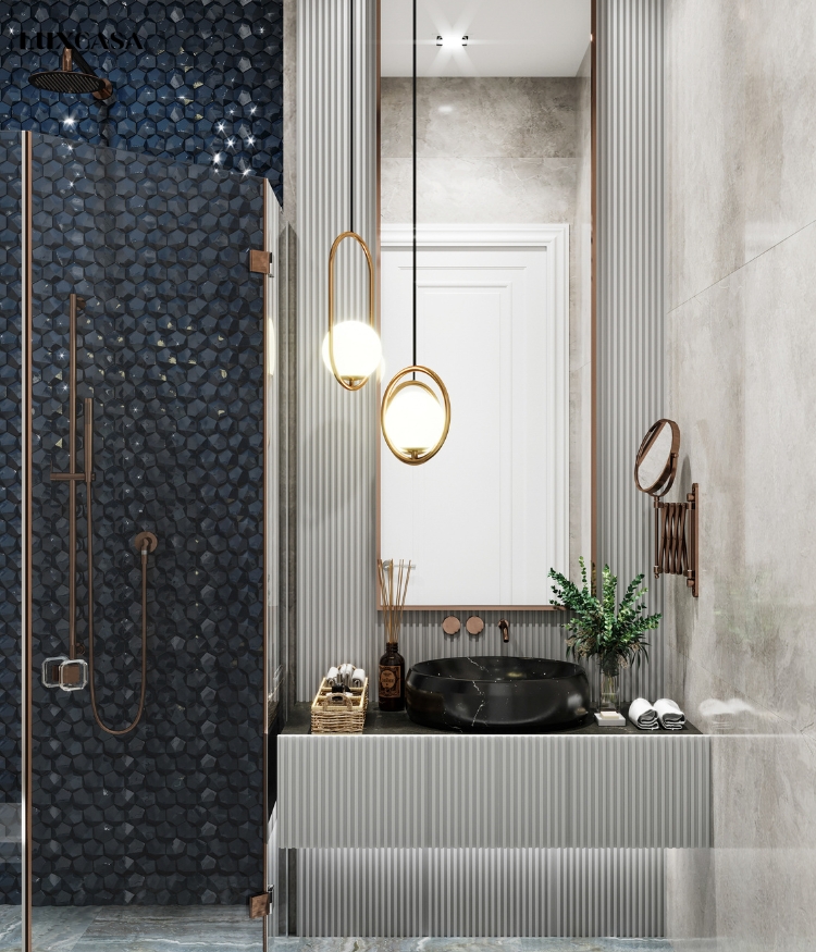 Tông màu xanh đen của gạch kết hợp với tính năng chống bám bẩn giúp tăng thêm sự sang trọng và cao cấp cho không gian phòng tắm.