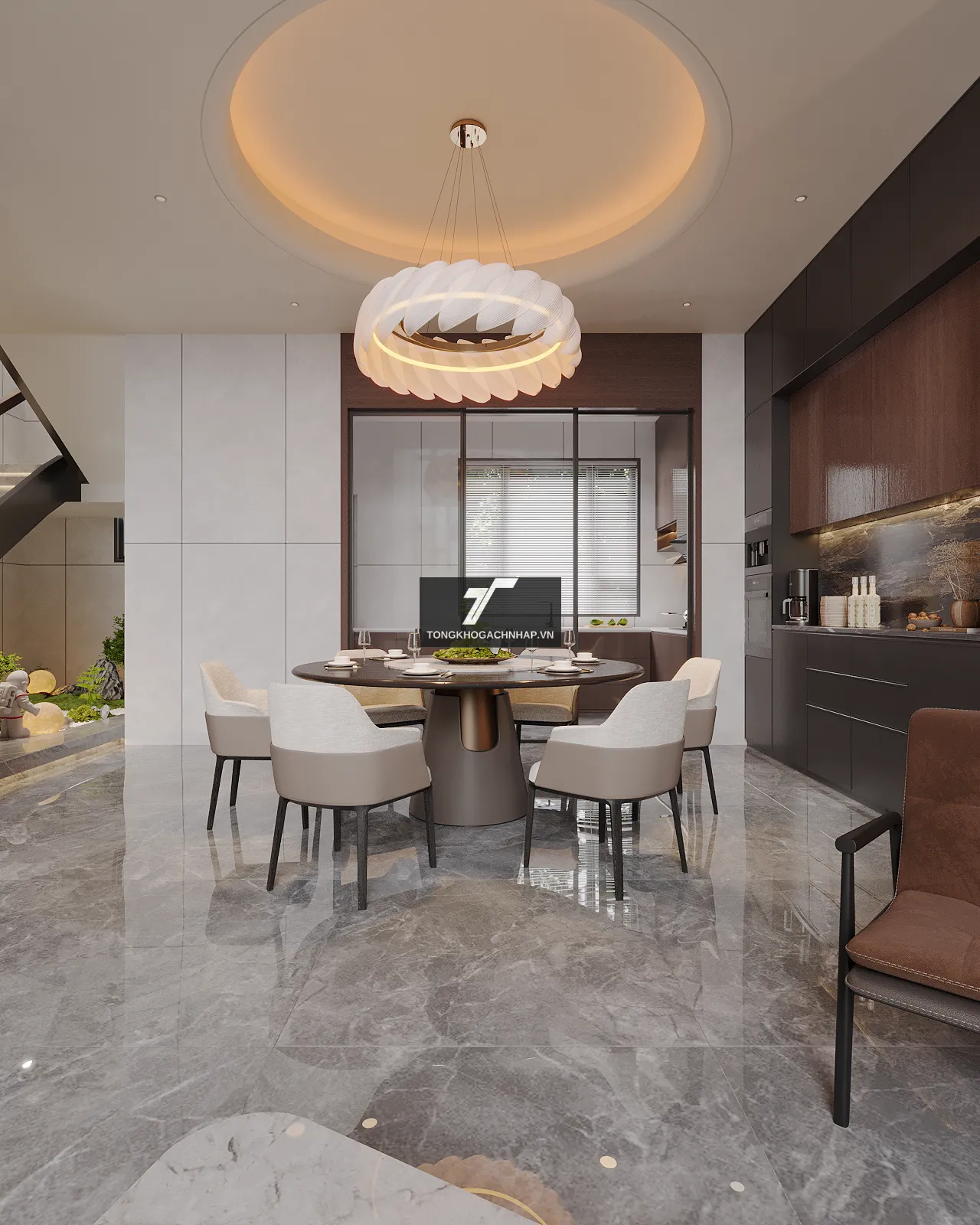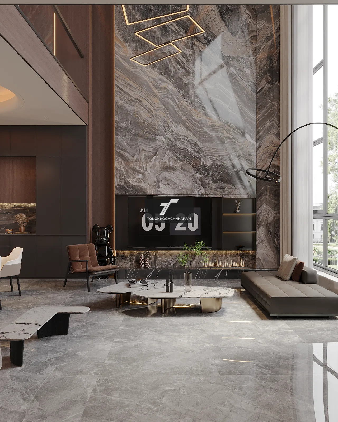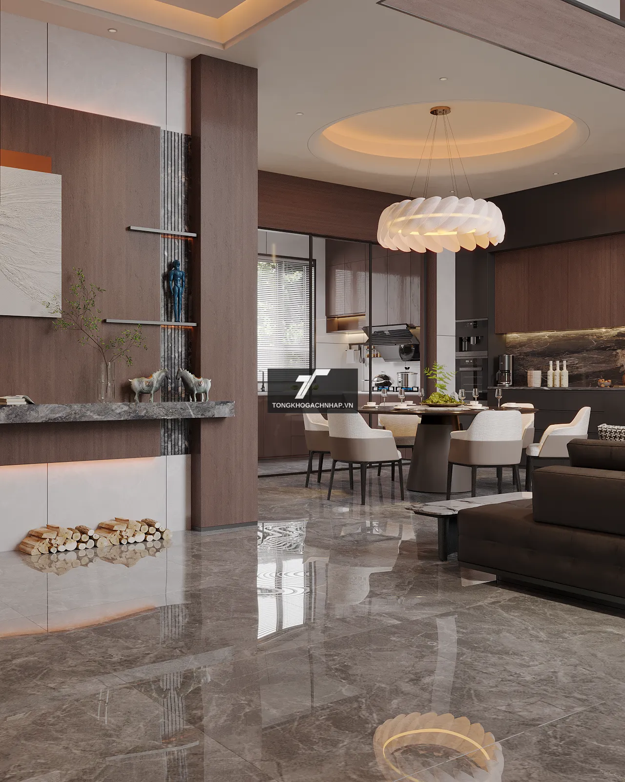 Dưới ánh đèn chùm lộng lẫy vào ban đêm, sàn nhà sẽ trở thành một "tấm gương" phản chiếu ánh sáng vô cùng lung linh. Độ cứng vượt trội của xương gạch Porcelain đảm bảo khả năng chịu lực cực tốt, chịu được mật độ đi lại cao và áp lực từ các đồ nội thất nặng mà không bị nứt vỡ. Việc chọn mẫu gạch này không chỉ là đầu tư cho cái đẹp mà còn là sự đảm bảo cho một không gian tiếp khách luôn bền bỉ và đẳng cấp theo năm tháng.