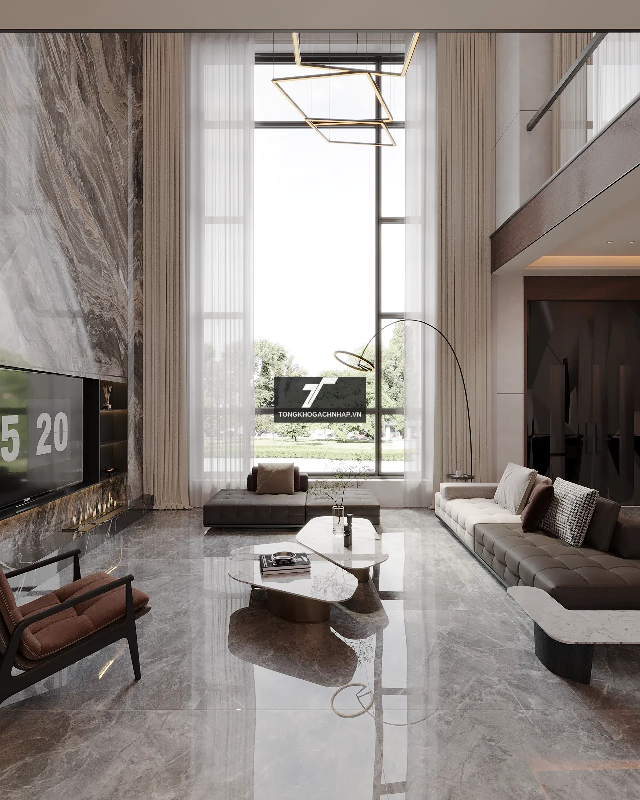Sự dịch chuyển từ các khổ gạch nhỏ sang khổ lớn 100x100cm đã thay đổi hoàn toàn diện mạo của các ngôi nhà phố và biệt thự. Sử dụng gạch 1000x1000mm giúp giảm thiểu tối đa các đường ron (mạch) gạch, từ đó tạo ra một mặt sàn liền mạch và thống nhất. Điều này giúp các căn phòng có diện tích rộng trông sẽ phóng khoáng và uy nghi hơn rất nhiều so với việc dùng gạch khổ nhỏ truyền thống.