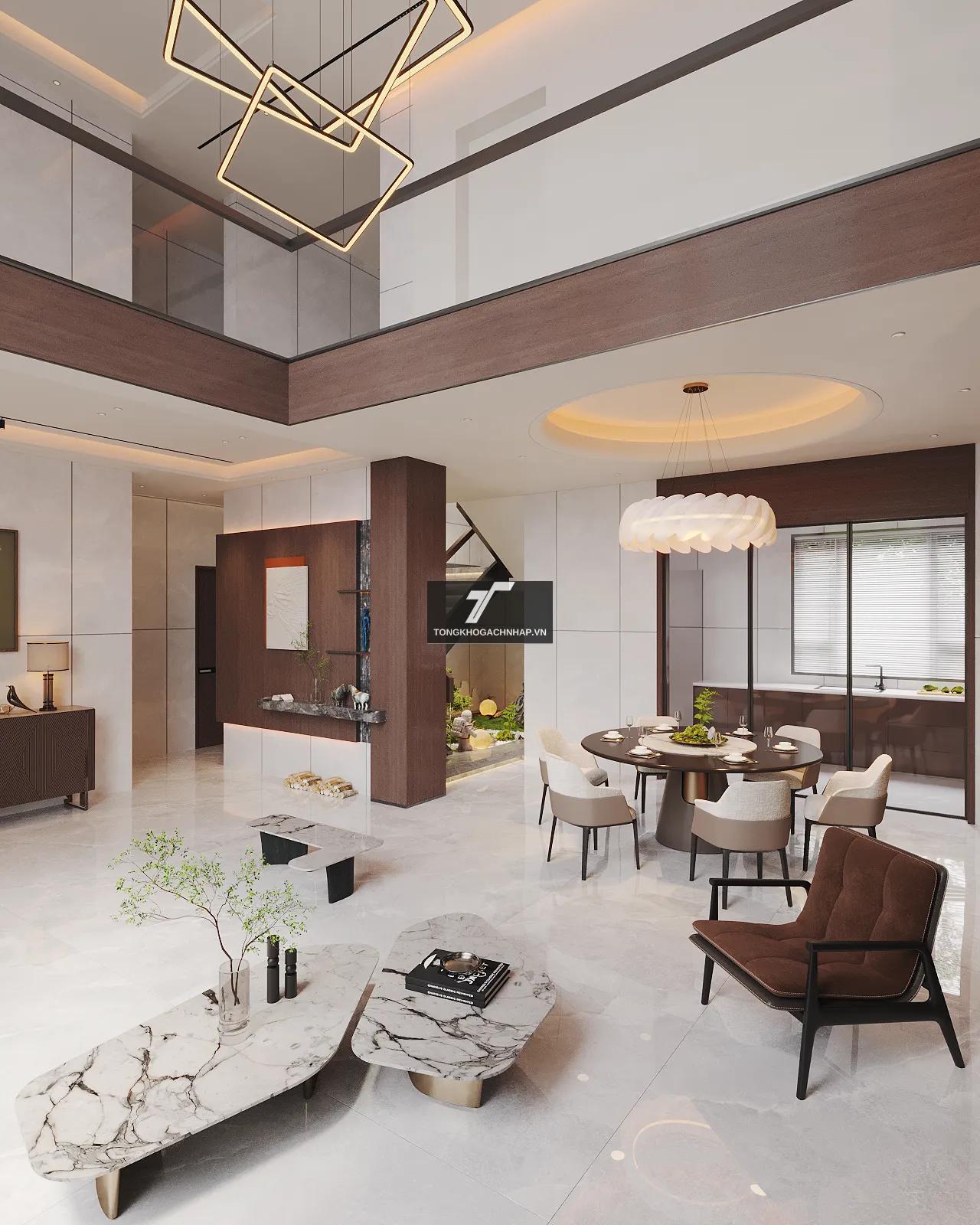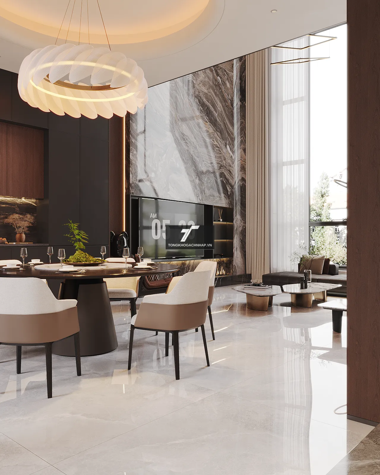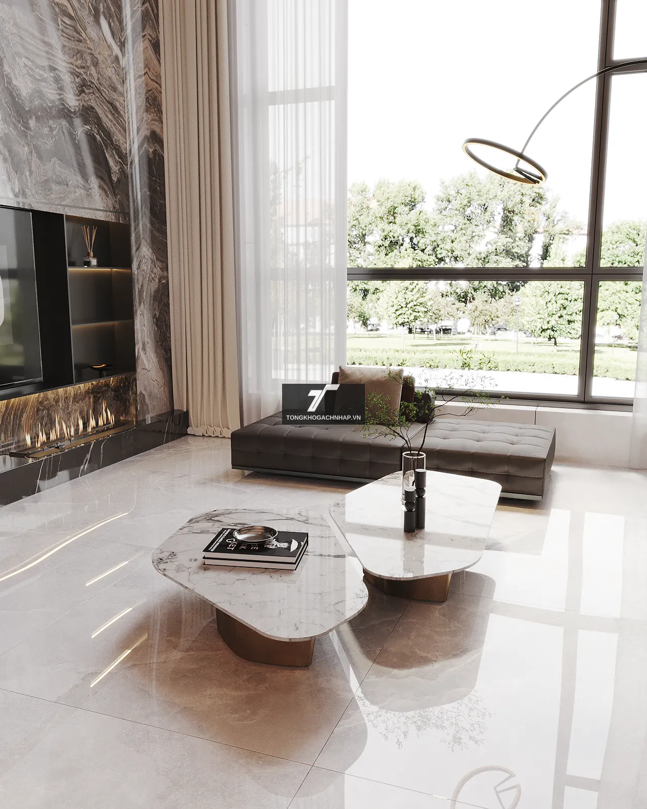 Dưới ánh đèn chùm lộng lẫy, bề mặt bóng của viên gạch sẽ tạo nên những điểm phản quang lung linh, biến phòng khách thành một sảnh chờ của khách sạn hạng sang. Với độ cứng vượt trội của xương gạch Porcelain nhập khẩu, bạn hoàn toàn có thể yên tâm về khả năng chịu lực tại khu vực có mật độ đi lại cao này. Sàn nhà sẽ luôn giữ được độ sáng bóng và vẻ đẹp như mới, bất kể thời gian hay tác động của ngoại lực.
