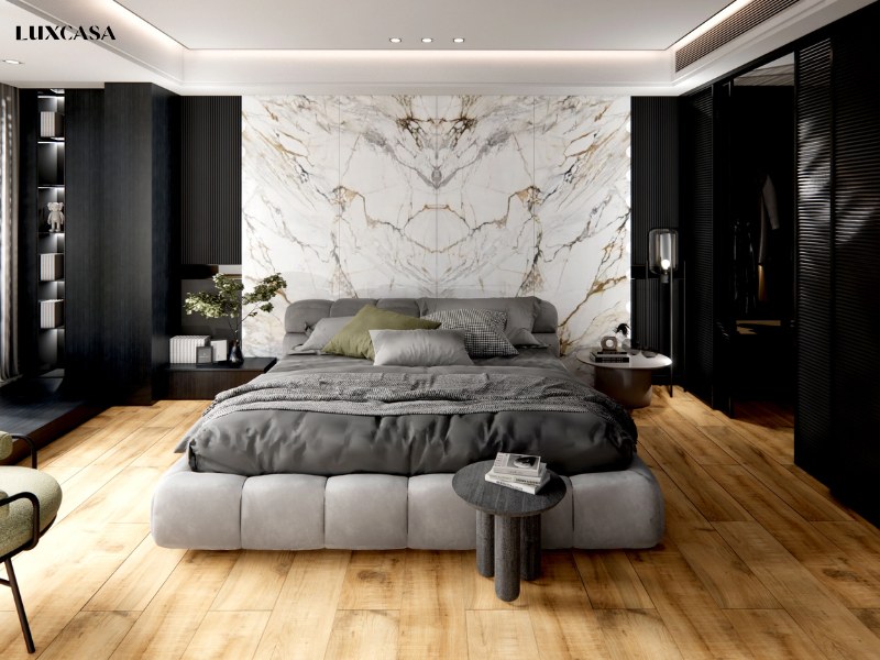 Thiết kế phòng ngủ sử dụng gạch khổ lớn ốp tường trang trí được rất nhiều khách hàng chú ý gần đây, mẫu gạch trên mã là LUXT268914B