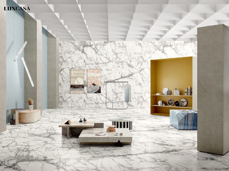 Đối với cách khu trung tâm thương mai, đại sảnh lớn điều cần có đầu tiên à gây được sự chú ý và tạo cái nhìn ấn tượng từ ban đầu. Bởi vậy, gạch khổ lớn màu trắng với các đường vân trằng chịt sẽ giúp bạn lo điều đó, thiết kế khổ lớn đem lại cái nhìn sang trọng và cao cấp hơn nhiều gạch bé và gạch tầm trung.