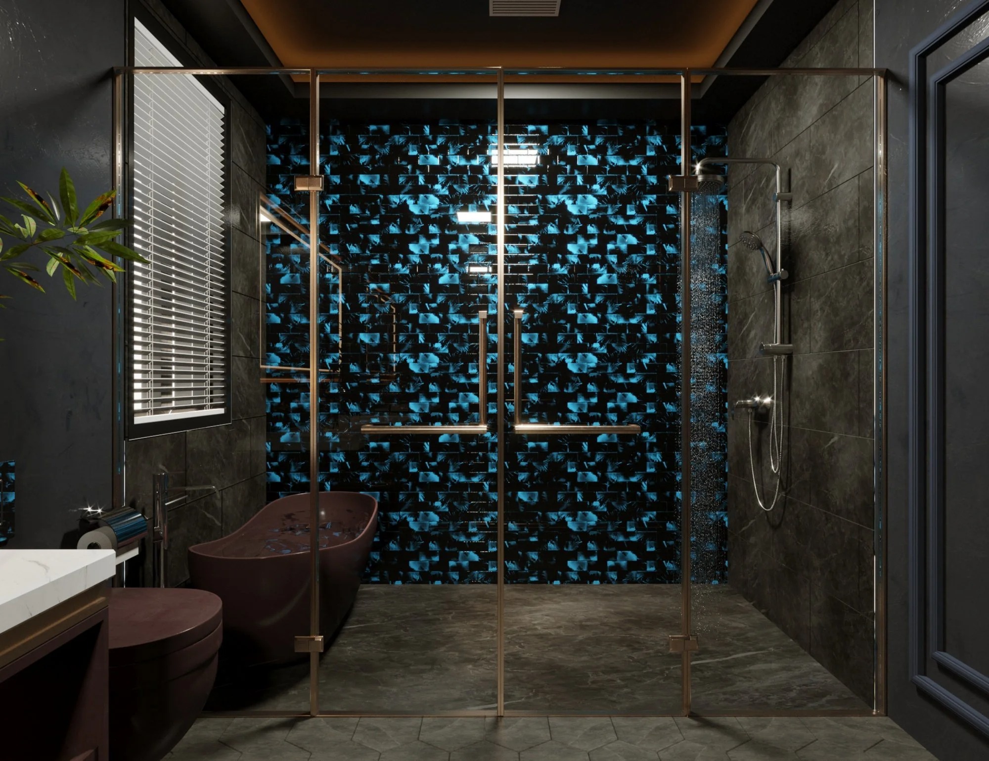 Tận dụng màu sắc độc đáo của gạch thẻ màu xanh dương để tạo ra phòng tắm sang trọng và đầy cá tính