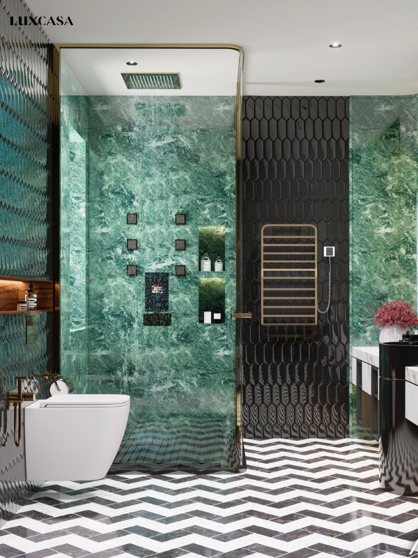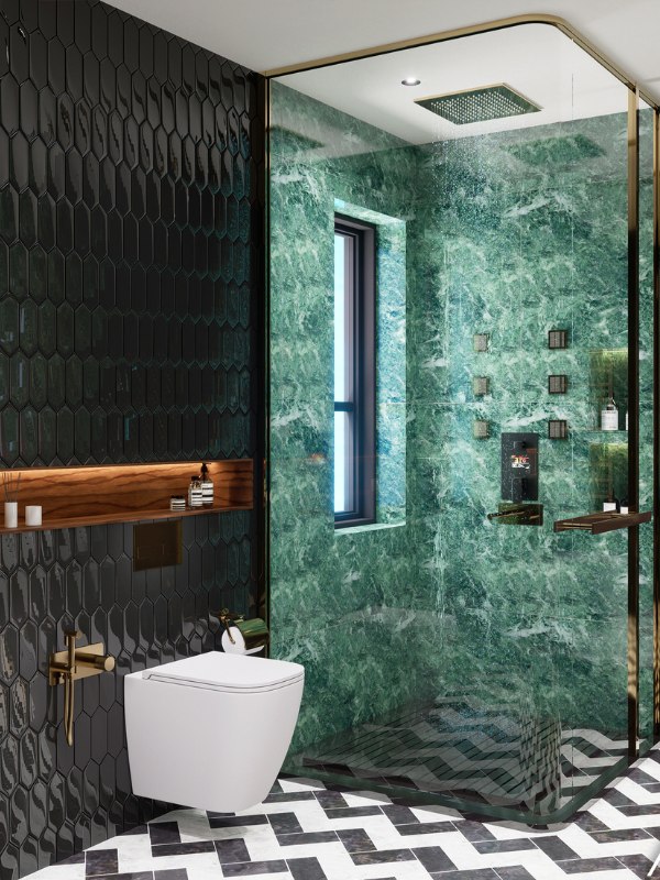 Sự kết hợp hoàn hảo của gạch tường màu xanh và thiết bị vệ sinh màu đen, một cách phối màu tinh tế để tạo ra vẻ đẹp mạnh mẽ và cao cấp. Màu xanh tươi mát và màu đen cứng cáp được kết hợp tạo ra một cảm giác độc đáo và hiện đại cho nhà tắm
