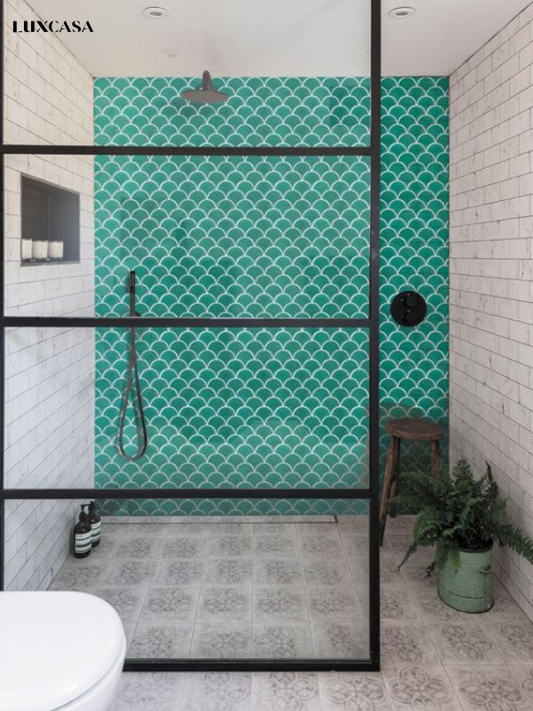 Một trong những xu hướng đang thịnh hàng gần đây là sử dụng gạch màu xanh ngọc ốp buống tắm đứng kết hợp với gạch tối màu, đây là cách kết hợp luôn mang đến sự sang trọng, cao cấp mà ít sự kết hợp nào so sánh được