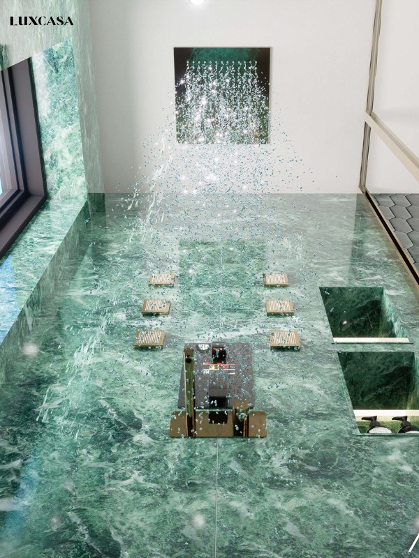 Mẫu gạch khổ lớn vân đá màu xanh ngọc này được sử dụng ốp tường nhà tắm lớn, nhà tắm master sang trọng và hiện đại, Các đường vân tự nhiên được nối với dày đặc với nhau tạo ra cảm giác như một bức tường đá tự nhiên