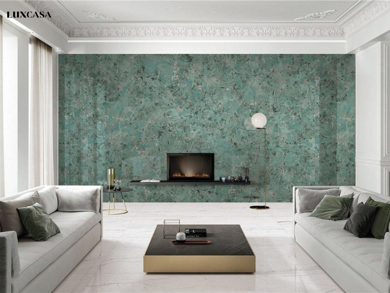 Gạch màu xanh ngọc được rất nhiều chủ nhà ưa thích để ốp tường phòng khách bởi bề mặt nhiều vân, khổ gạch lớn tạo nên một không gian sang trọng và cao cấp. Ngoài ra, mẫu gạch này có xương gạch làm từ >70% bột đá giúp tăng độ cứng và bền bỉ
