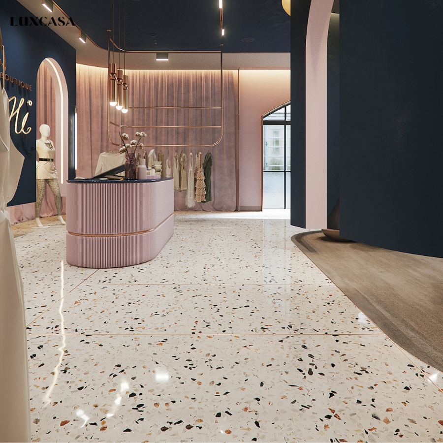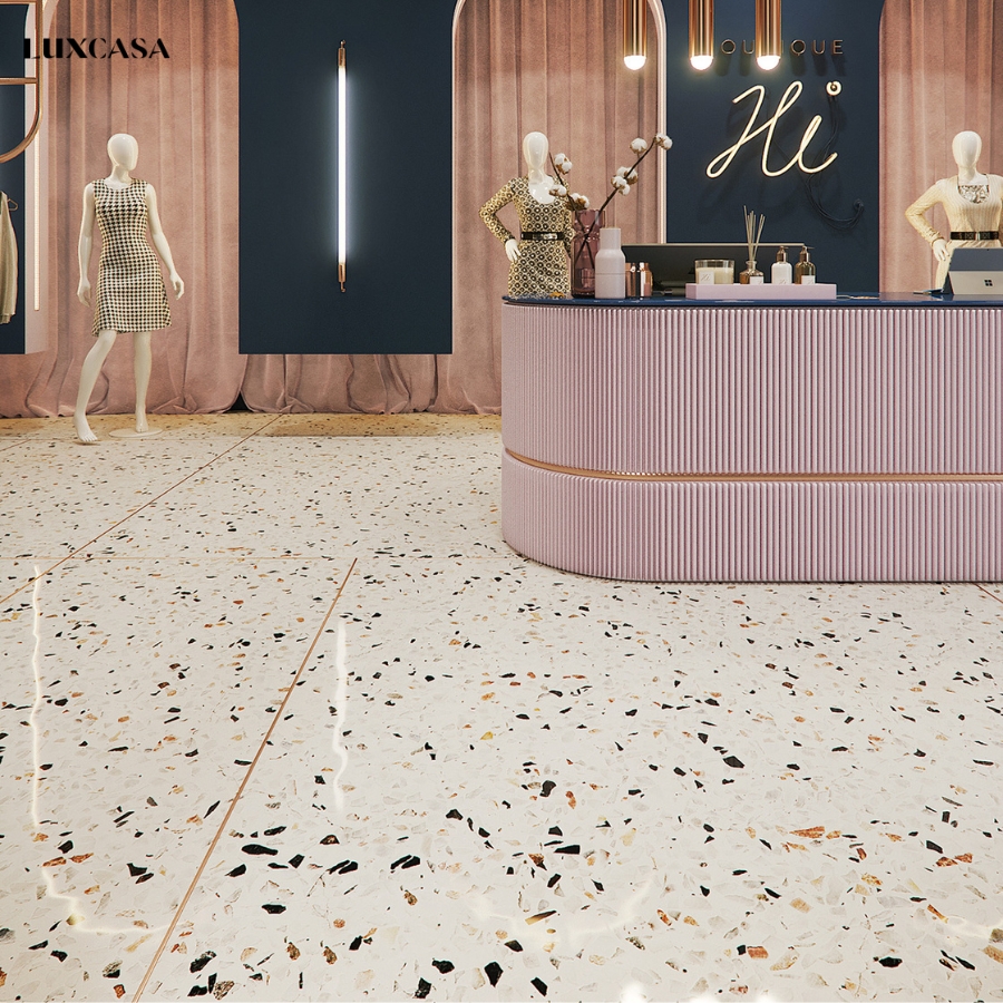 Sàn Terrazzo không chỉ là một lựa chọn trang trí, mà còn là biểu tượng cho sự sang trọng và tối giản trong thiết kế shop thời trang. Với bề mặt bóng mịn và màu sắc tinh tế, terrazzo tạo nên một vẻ đẹp đầy lôi cuốn và thời thượng. Khả năng phản chiếu ánh sáng giúp tạo ra không gian sáng hơn, cùng với màu sắc tươi mới giúp tạo cảm giác thoải mái và thư thái cho khách hàng. Đọc thêm bài viết Gạch Giả Gỗ 60x60-Tạo nên không gian ấm cúng cho mọi không gian trong ngôi nhà đặc biệt là phòng ngủ và phòng khách.