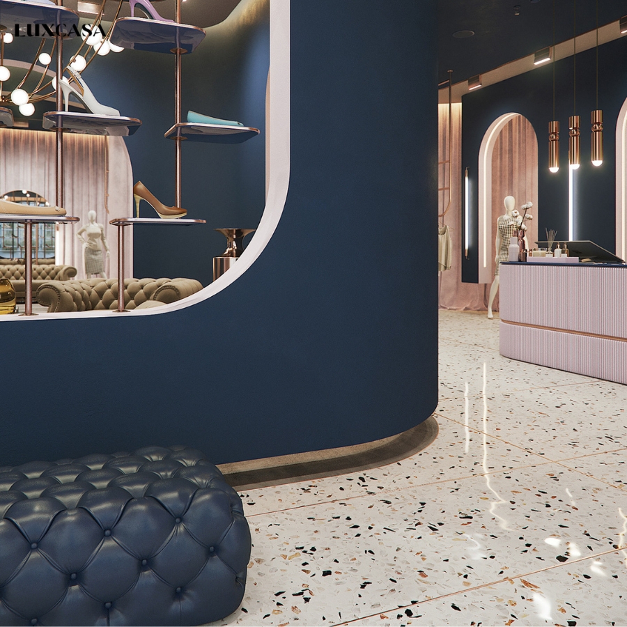 Sàn Terrazzo không chỉ đóng vai trò là một bề mặt sàn thông thường, mà còn góp phần tạo nên một không gian mua sắm độc đáo và ấn tượng. Sự kết hợp độc đáo giữa vẻ đẹp sang trọng của Terrazzo và các sản phẩm thời trang hiện đại tạo nên một không gian mua sắm thu hút ngay từ cái nhìn đầu tiên.