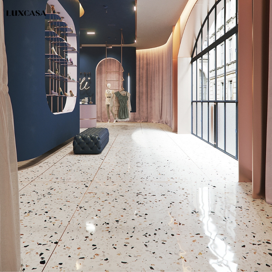 Với sự kết hợp tinh tế của bề mặt bóng mịn và hoa văn đa dạng, gạch Terrazzo thực sự là yếu tố tạo nên không gian sang trọng cho shop thời trang. Từ vẻ đẹp độc đáo đến tính thân thiện với môi trường và khả năng bền bỉ, Terrazzo đã không chỉ trang trí, mà còn làm thay đổi cách khách hàng trải nghiệm không gian mua sắm, góp phần nâng tầm giá trị thương hiệu.