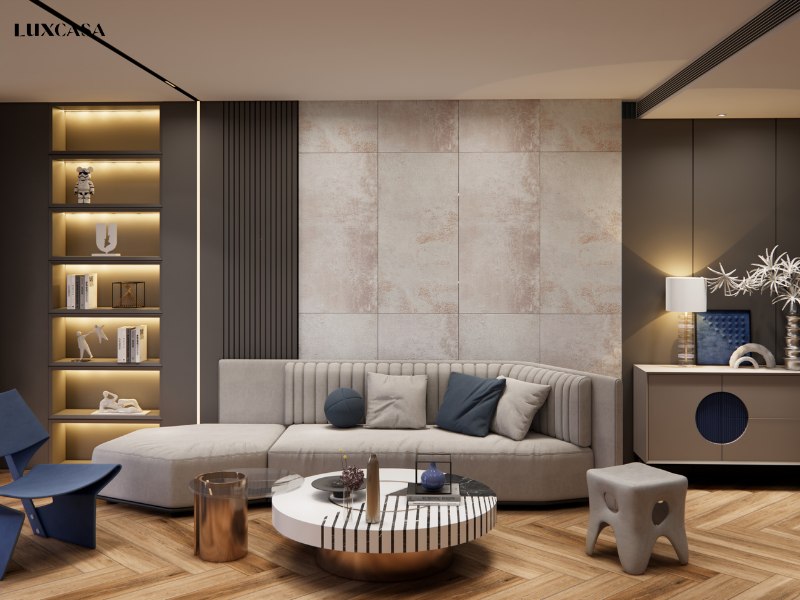 Sử dụng gạch vân gỗ dạng thẻ lát phòng khách đang được nhiều người ưa chuộng