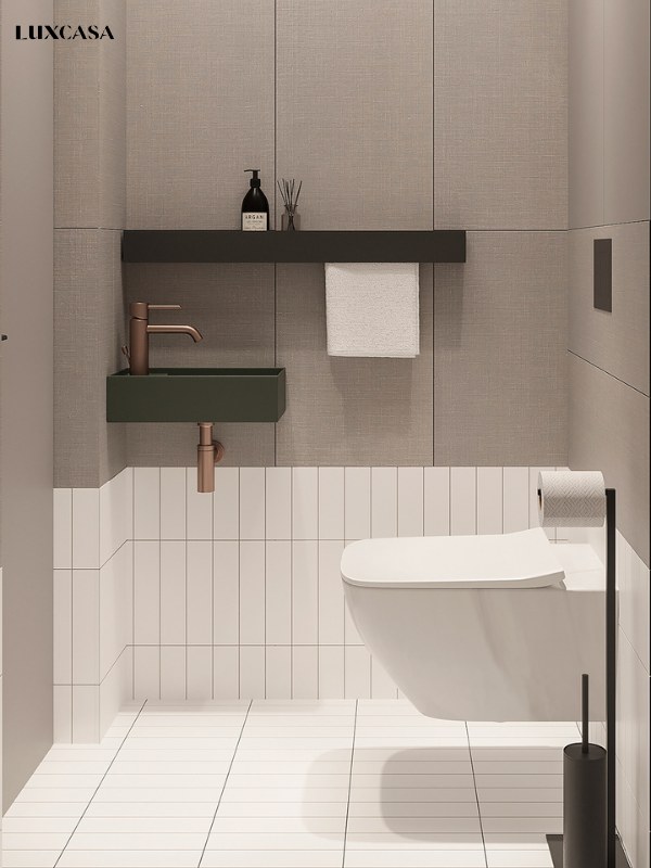 Nhà tắm ốp gạch thẻ màu trắng phần trên, ở dưới ốp và lát gạch terrazzo màu tối đem lại cái nhìn đối nghịch cực kỳ bắt mắt và gây ấn tượng mạnh