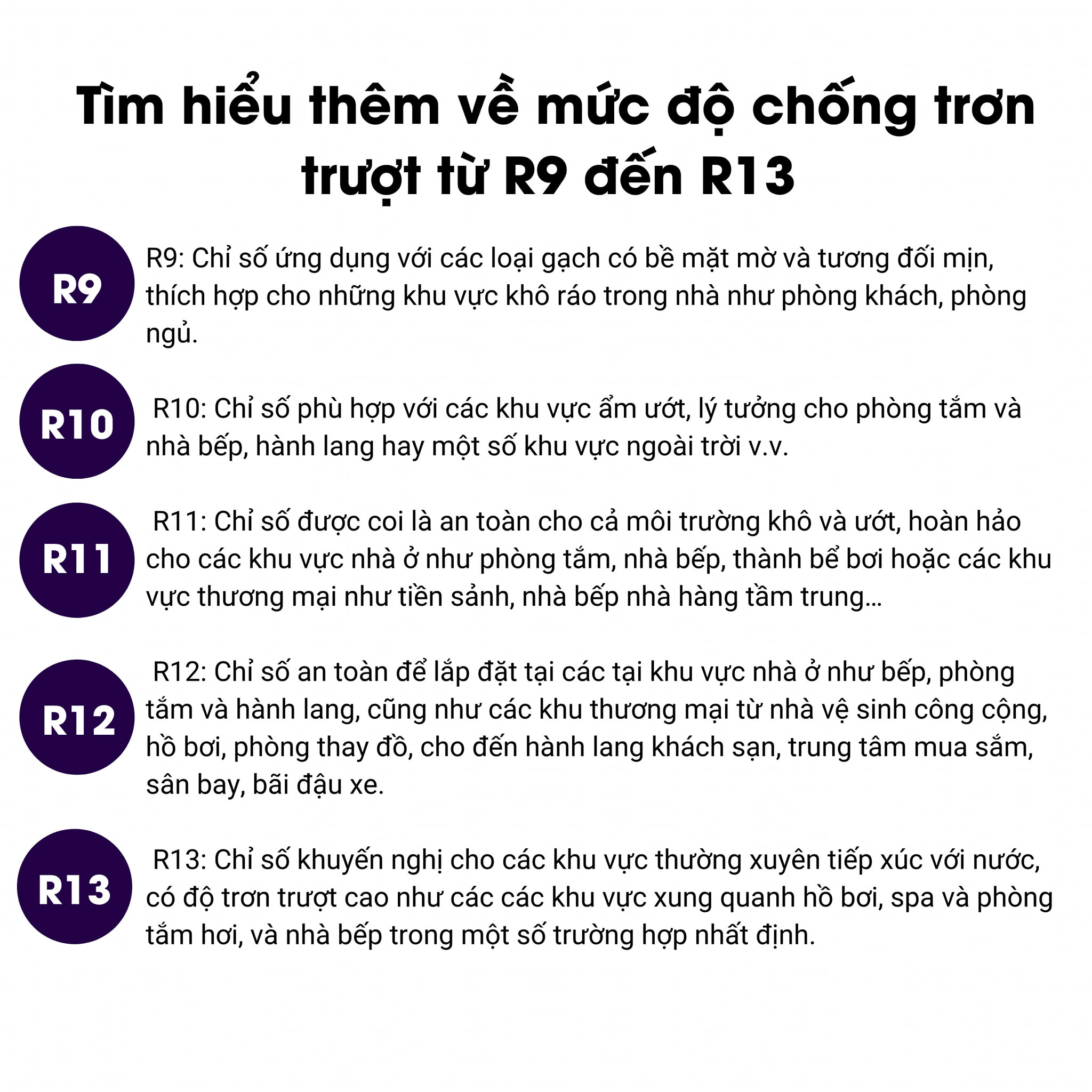 R9: Đây là cấp độ thấp nhất, chỉ phù hợp với các khu vực khô ráo trong nhà như phòng khách, phòng ngủ. Độ nghiêng của sàn khi bị trượt dưới 10 độ.
