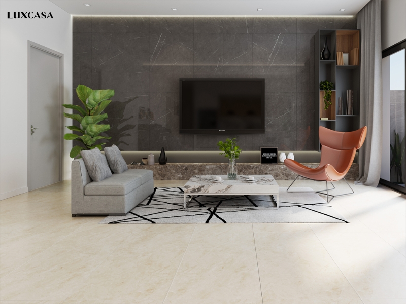 Xu hương dùng gạch khổ lớn lát phòng khach để giúp không gian liền mạch và cao cấp hơn