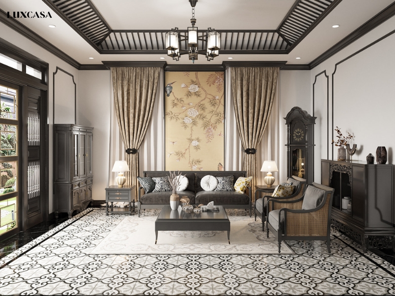 Xu hướng dùng gạch bông lát nền phòng khách theo phong cách Indochone