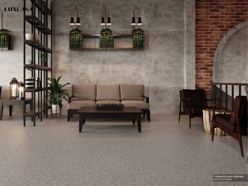 Phong cách industrial là một trong những xu hướng thiết kế nội thất phổ biến hiện nay, đặc biệt là trong thiết kế phòng khách. Với phong cách này, gạch lát nền thường có màu sắc tối và có bề mặt gợn sóng, vân đá hoặc bê tông để tạo ra sự thô mạnh. Ngoài ra, các kích thước lớn và khối lượng của gạch cũng thường được ưa chuộng, như gạch 60x60 hoặc 80x80, 60x120, 75x150cm tạo ra cảm giác ấn tượng và mạnh mẽ. Bố cục gạch thường là hình vuông hoặc chữ nhật đơn giản, và có thể được phối hợp với các vật liệu khác như kim loại, gỗ và bê tông để tạo ra một không gian phòng khách mang tính công nghiệp và cổ điển.